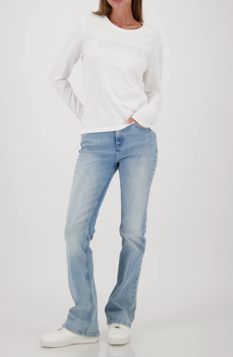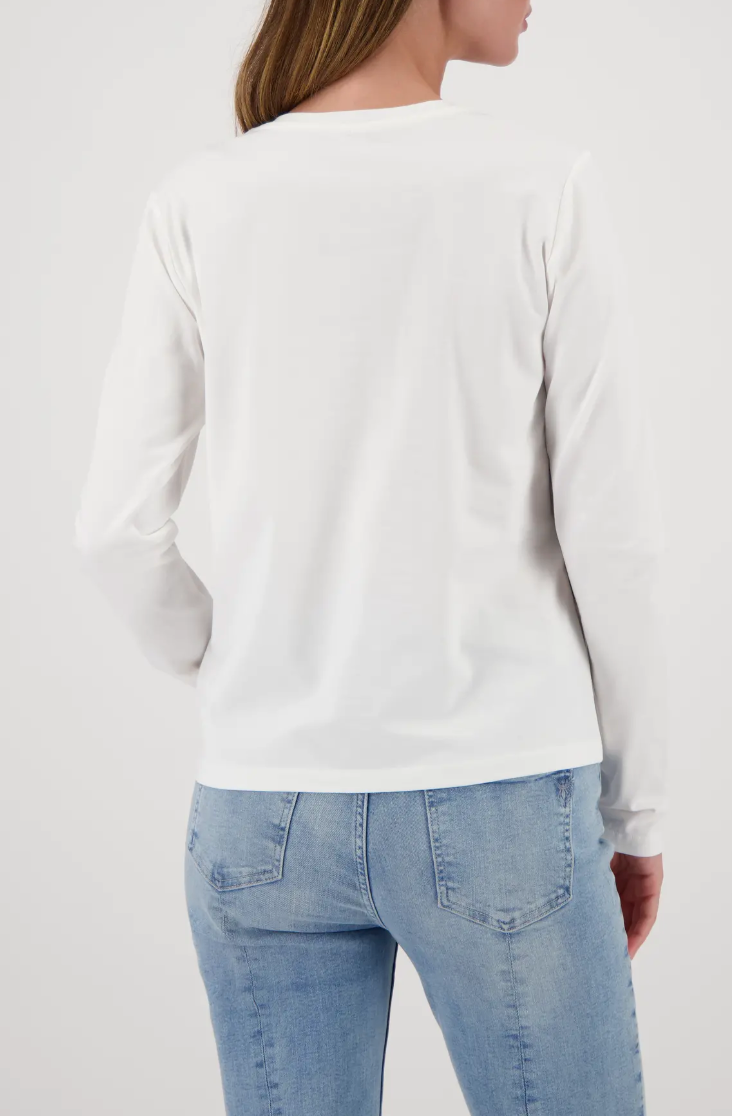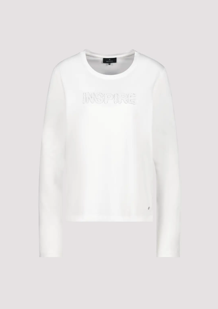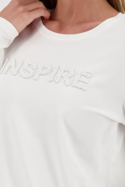 Discover our long-sleeved shirt made from high-quality cotton: elastic material, round neckline, adorned with pearls and decorative lettering.