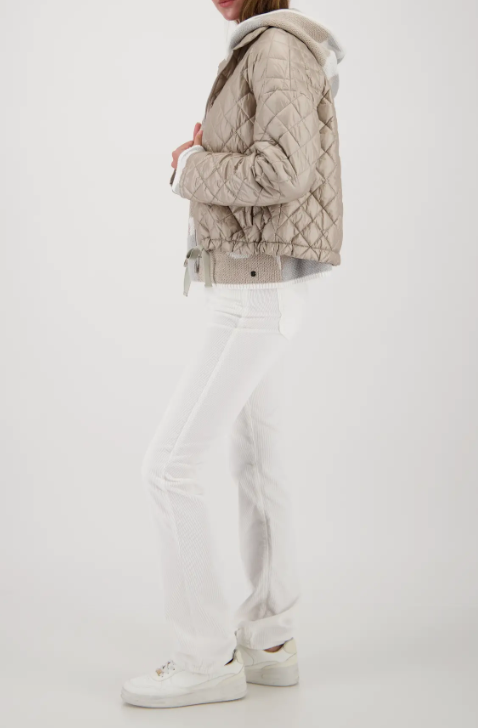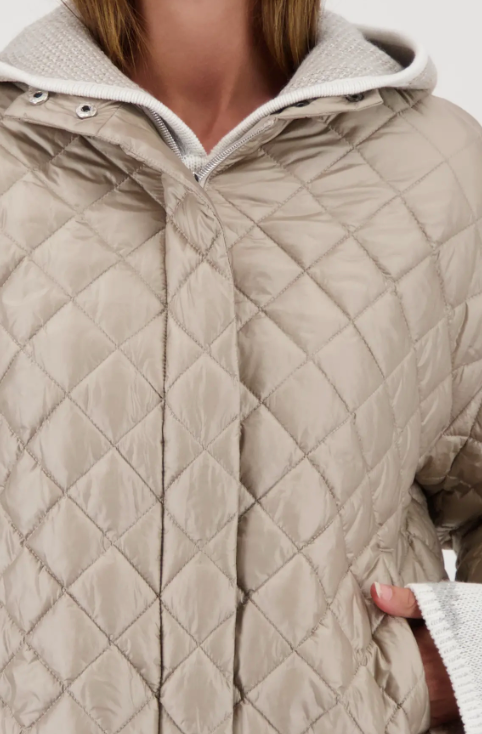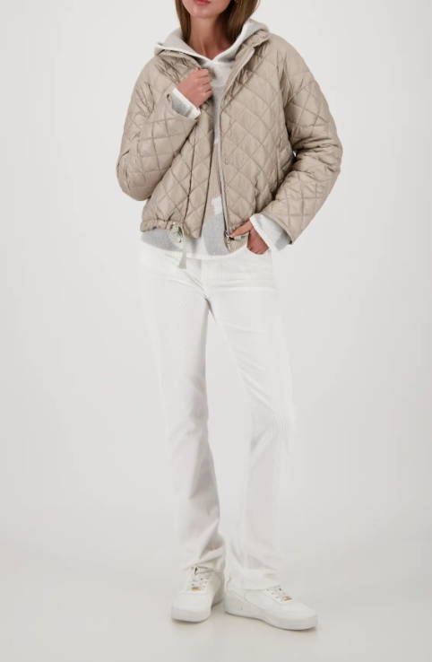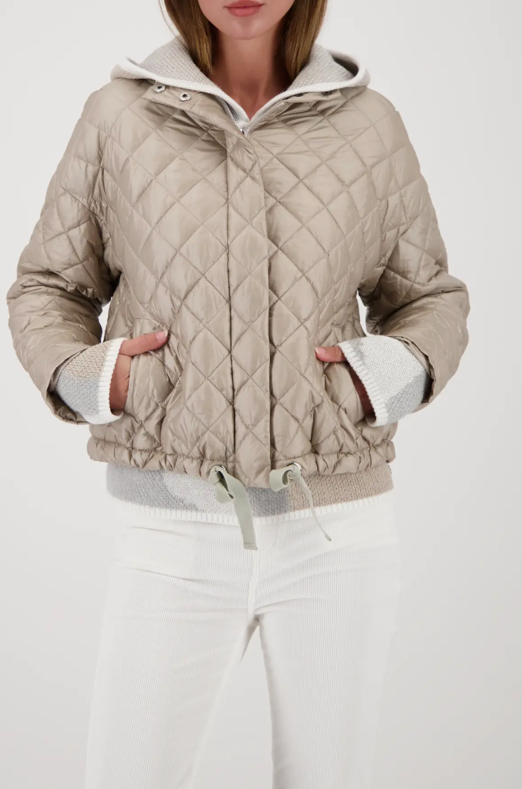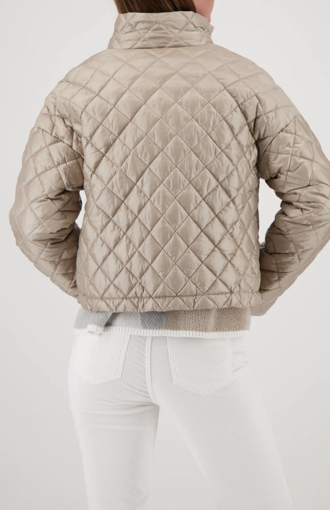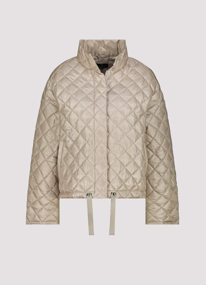 Elegant quilted jacket with stand-up collar and practical side pockets for a modern, stylish appearance.