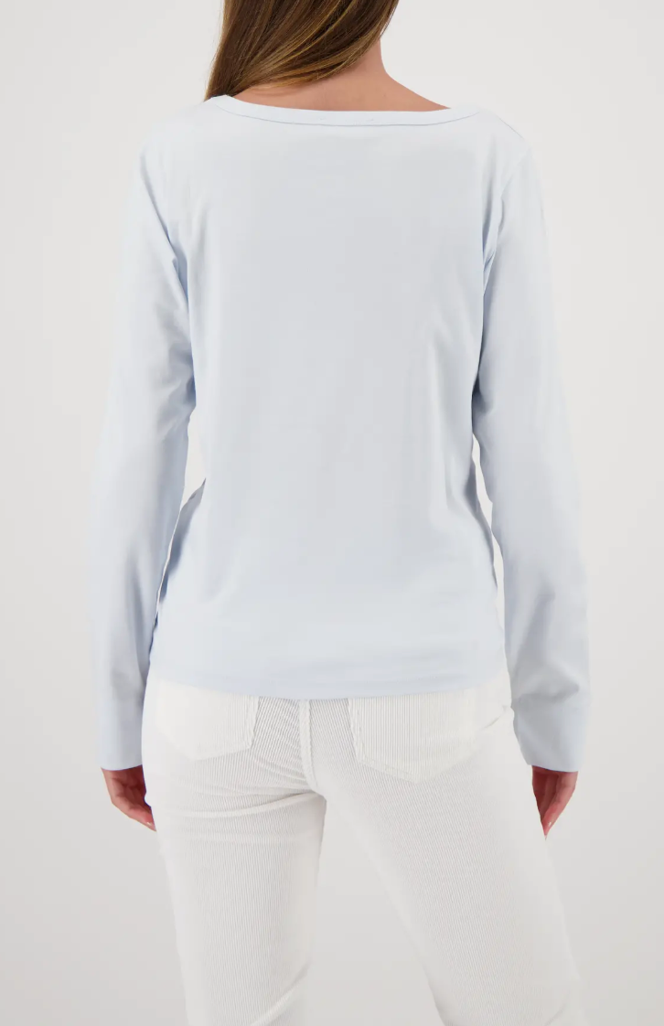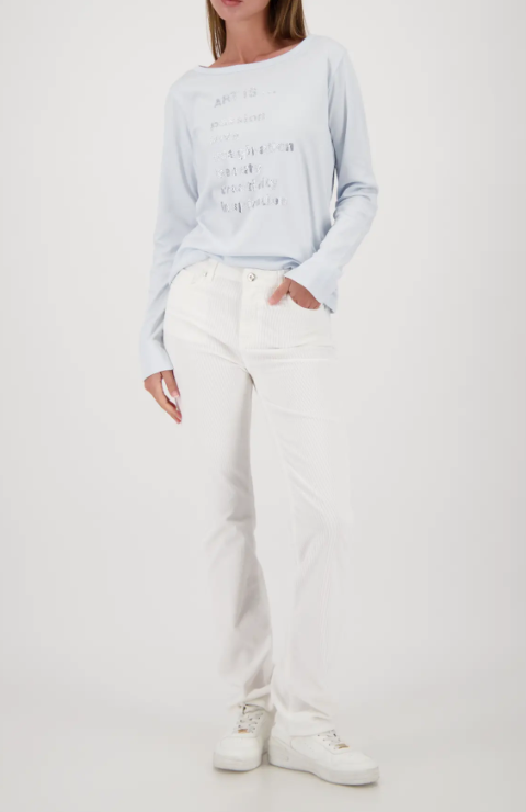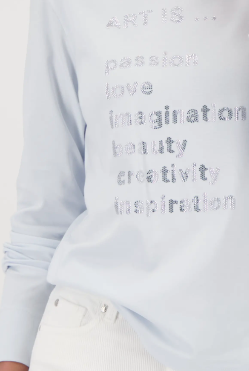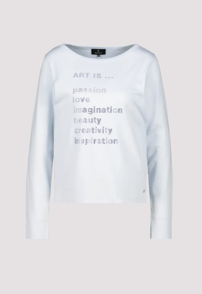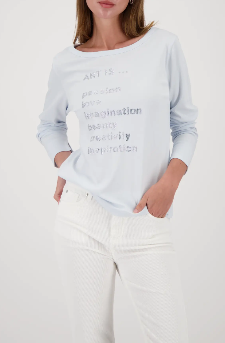 Elegant long-sleeve shirt made of 100% cotton with a boat neck and sparkling rhinestone lettering – perfect for style-conscious women.