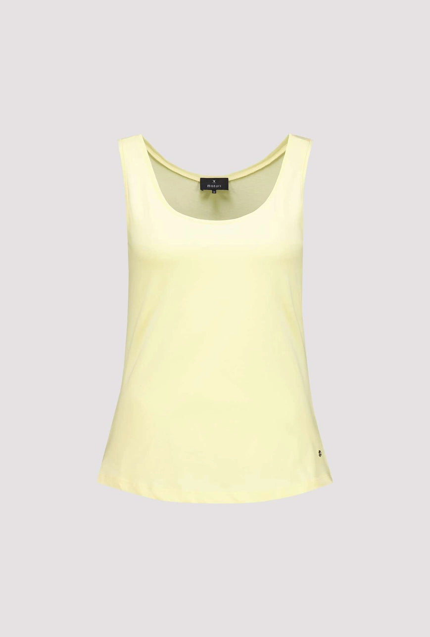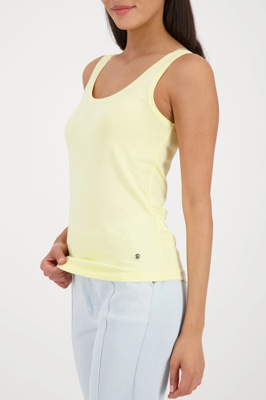 This basic top is slightly fitted and features wide straps and a rounded hem.