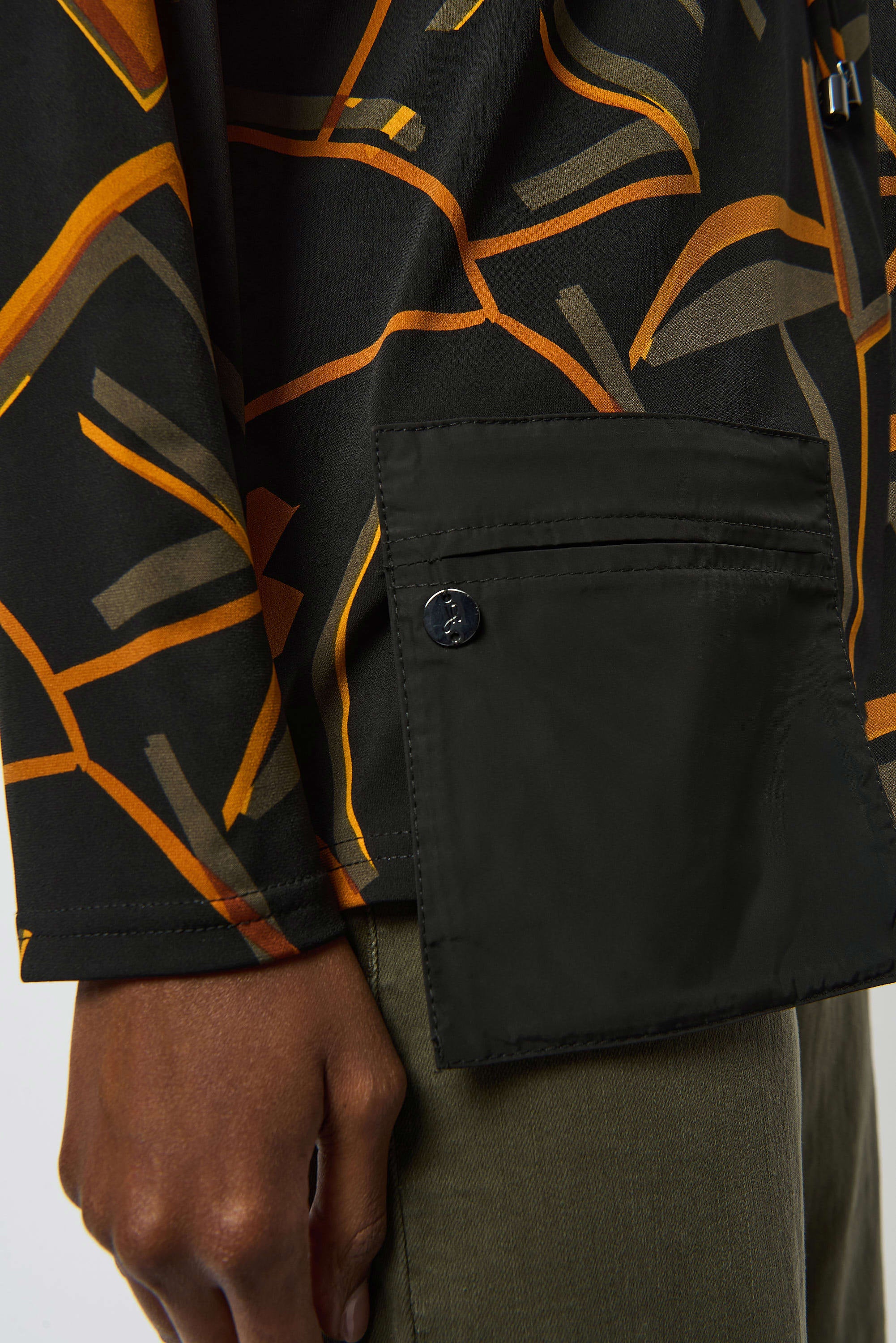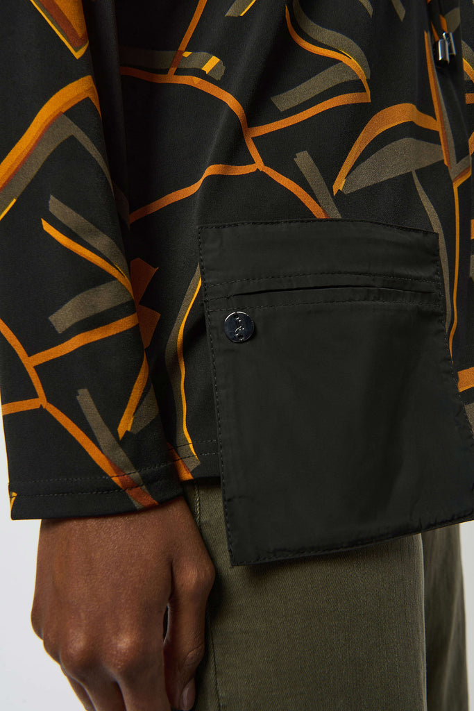 Bask in the undeniable elegance of this silky knit top boasting a captivating abstract print. The memory funnel collar with drawstrings brings a unique style and versatility to the piece. The long dolman sleeves complement the bold boxy silhouette and the front pocket adds extra charm.