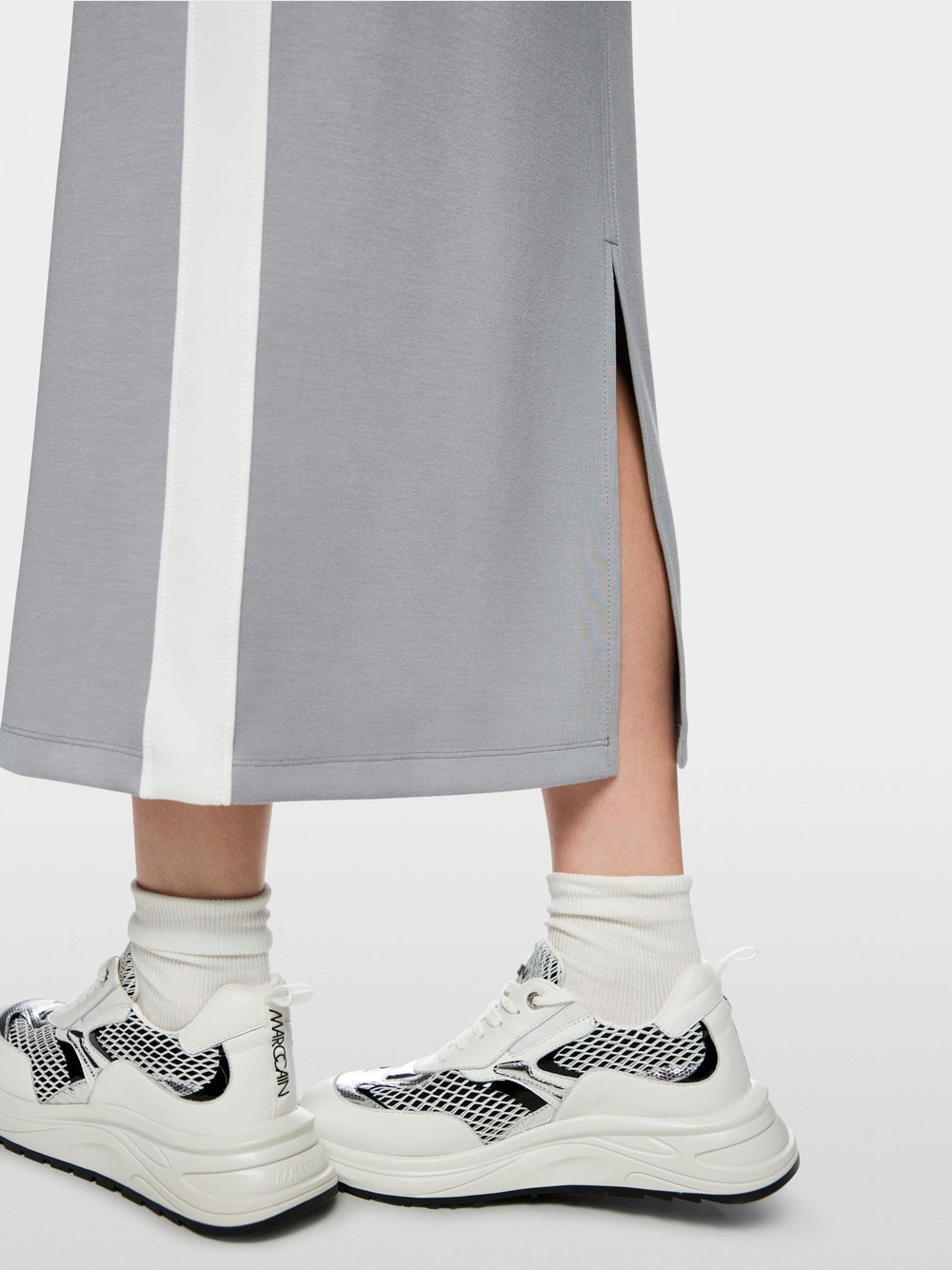 Comfortable midi-length skirt with a practical elasticated waistband and drawstring. The soft material blend is elastic and feels pleasant against the skin. The contrasting stripes on the sides and pockets are a highlight. A slit in the centre back offers additional freedom of movement. A small Marc Cain Sports logo is also attached to the pocket.