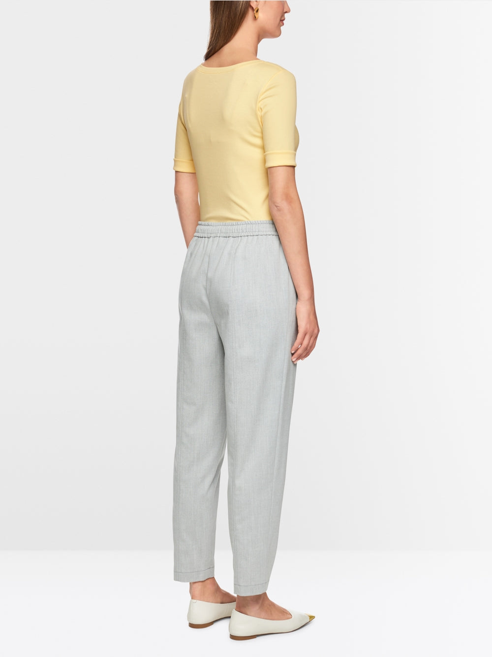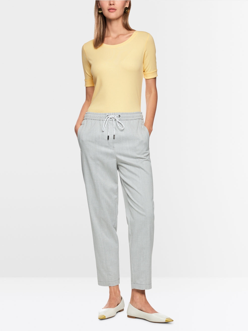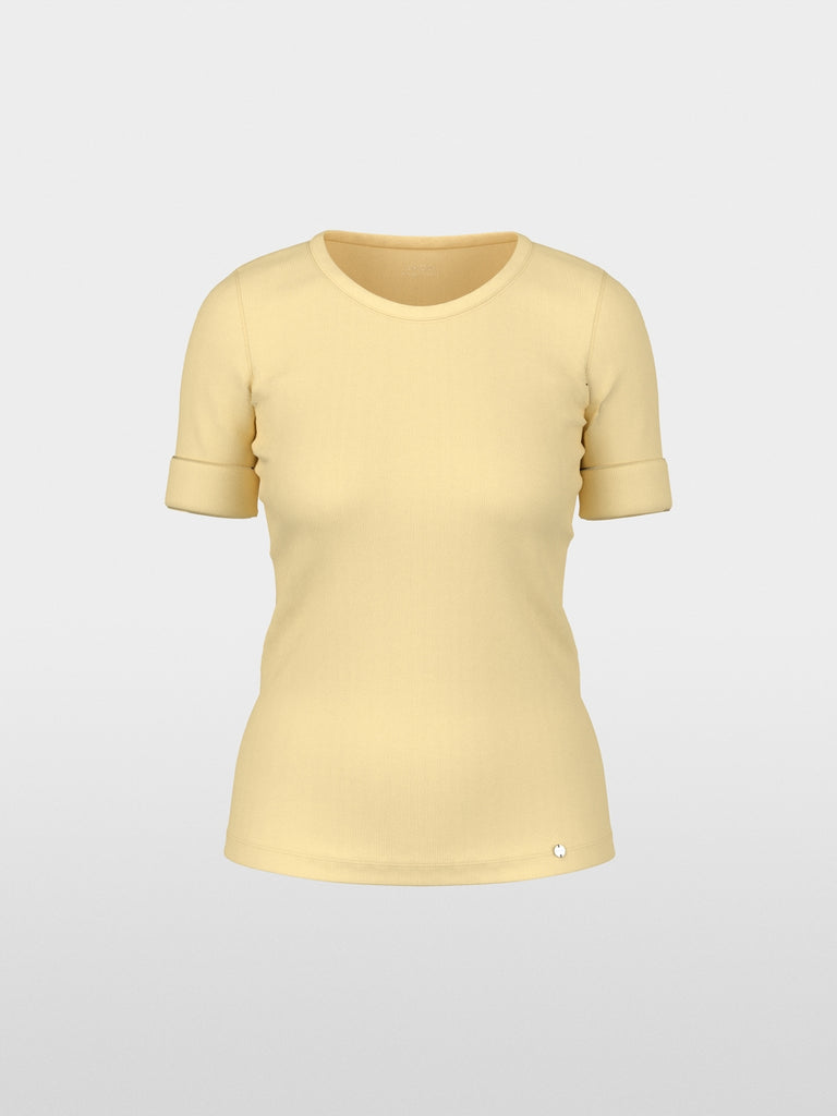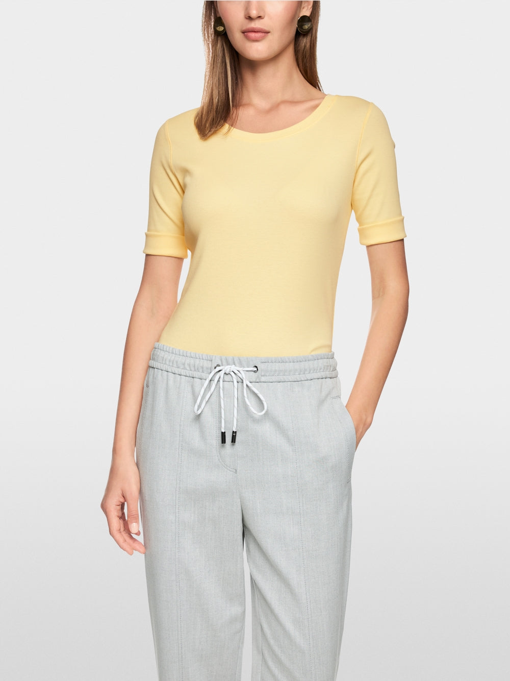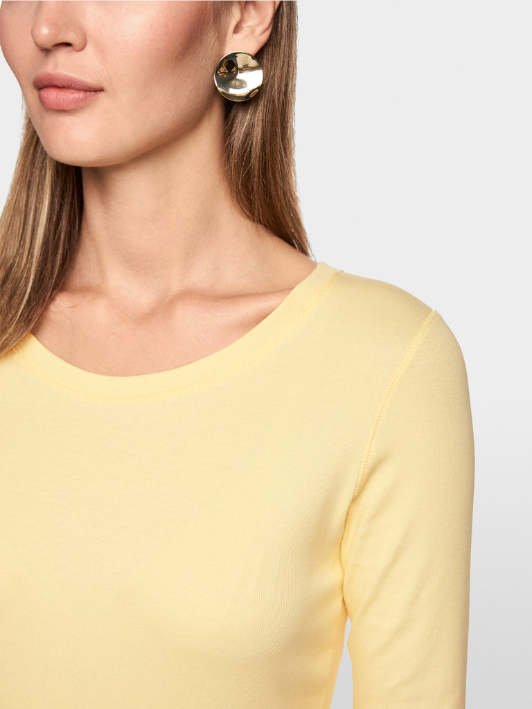 Shirt made of stretchy cotton rib. The model has a slim, straight shape and an open hem. Stylistic details include 3/4 sleeves and a round neckline. The neckline is finished with a fine ribbed cuff, and the sleeve hem with overlock stitching. A versatile piece for the basic wardrobe.
