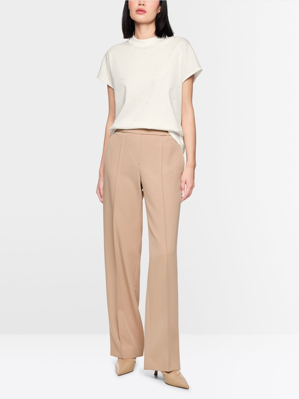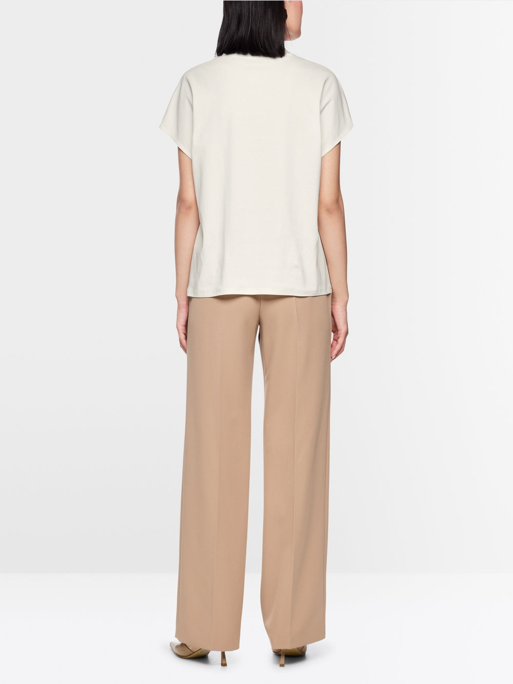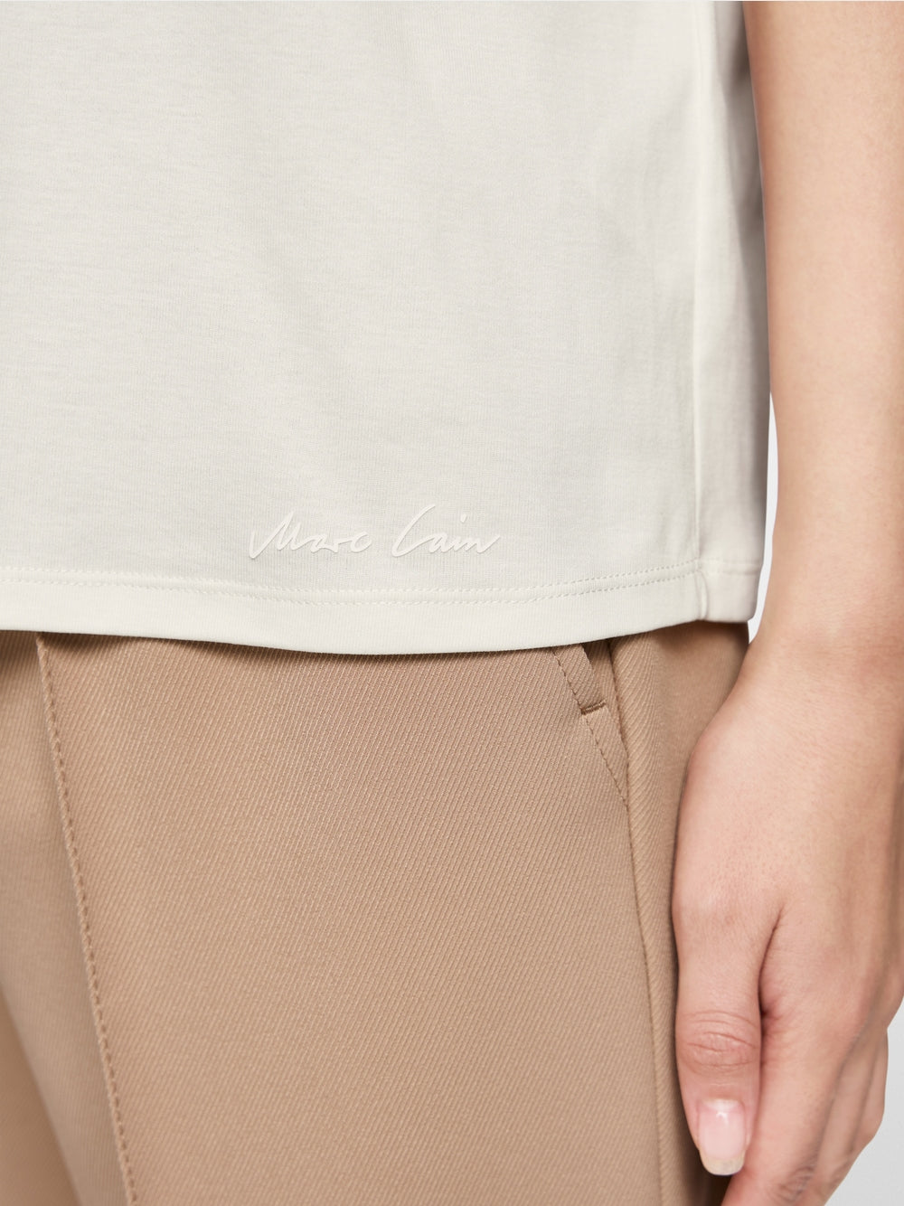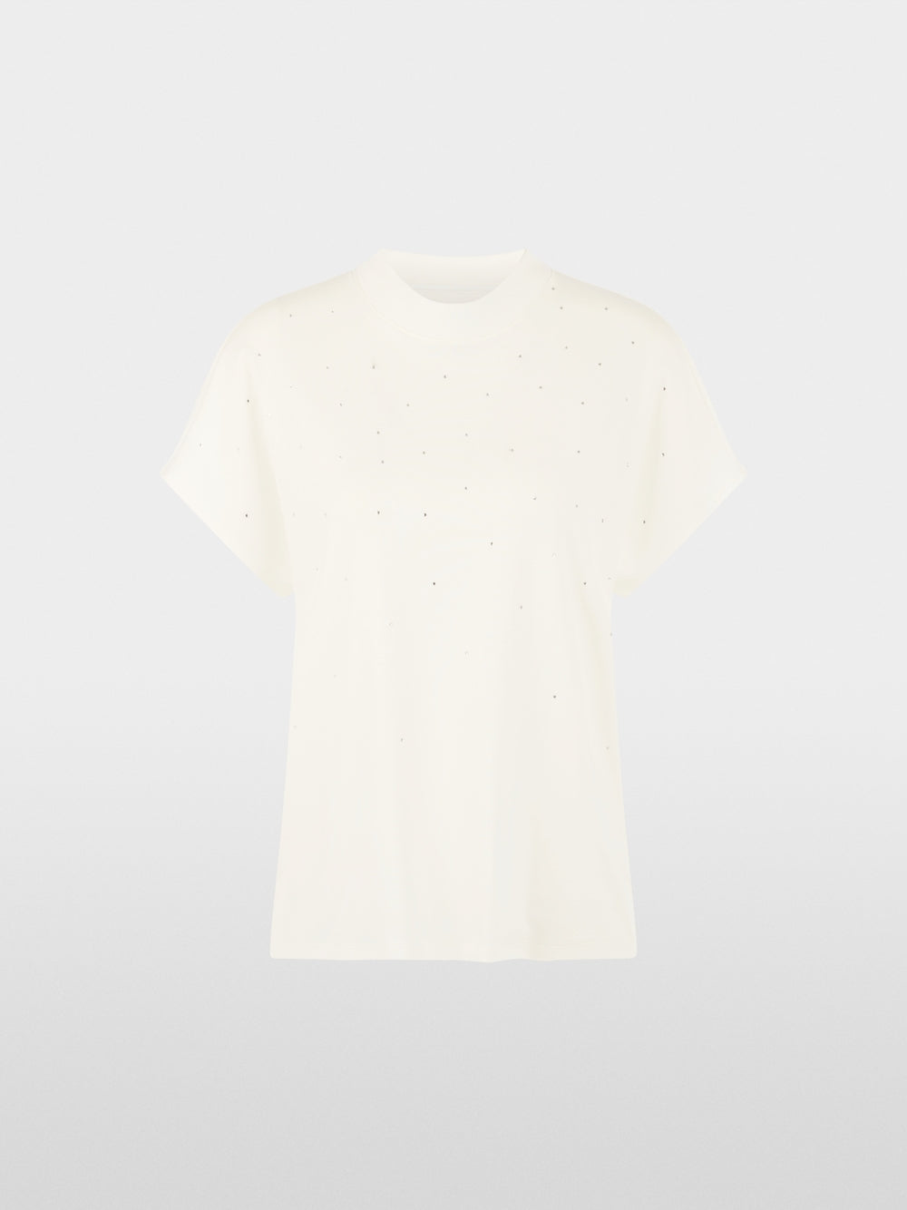 This short-sleeved T-shirt is made from a cotton-elastane blend and features a loose fit. The dropped shoulders and round neckline with ribbed cuffs complete the look. The upper part of the T-shirt is embellished with sparkling hot fix stones, adding a stylish, subtle accent. Perfect for casual and elegant looks.