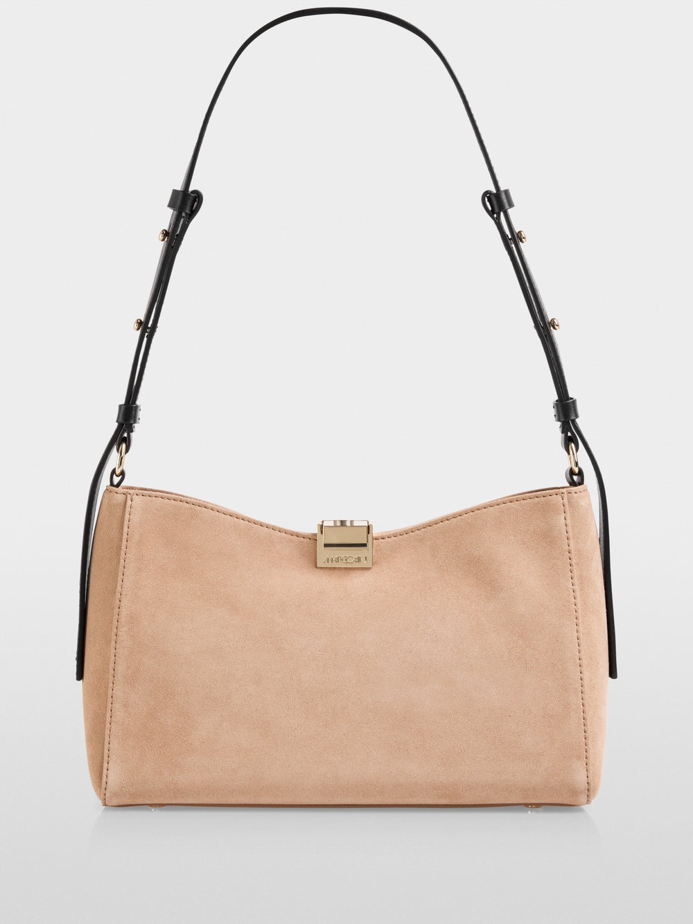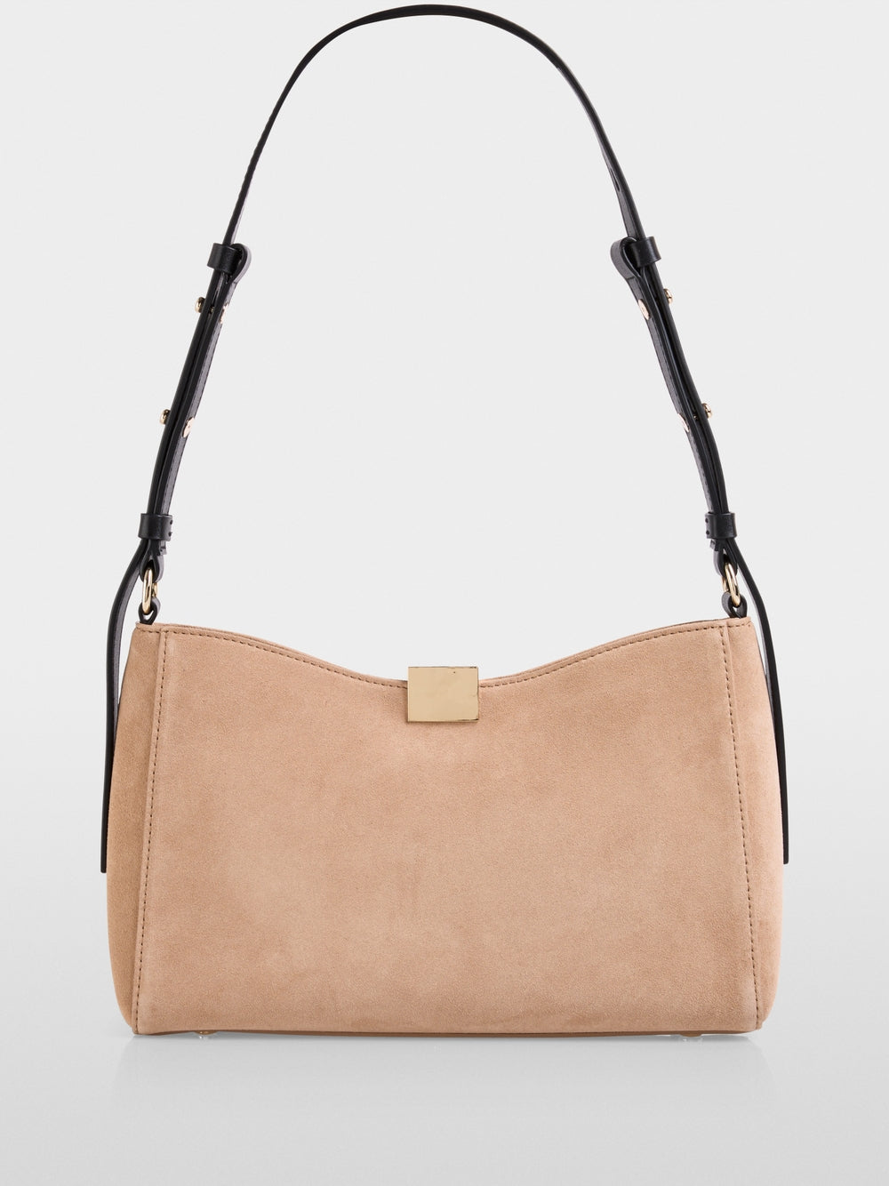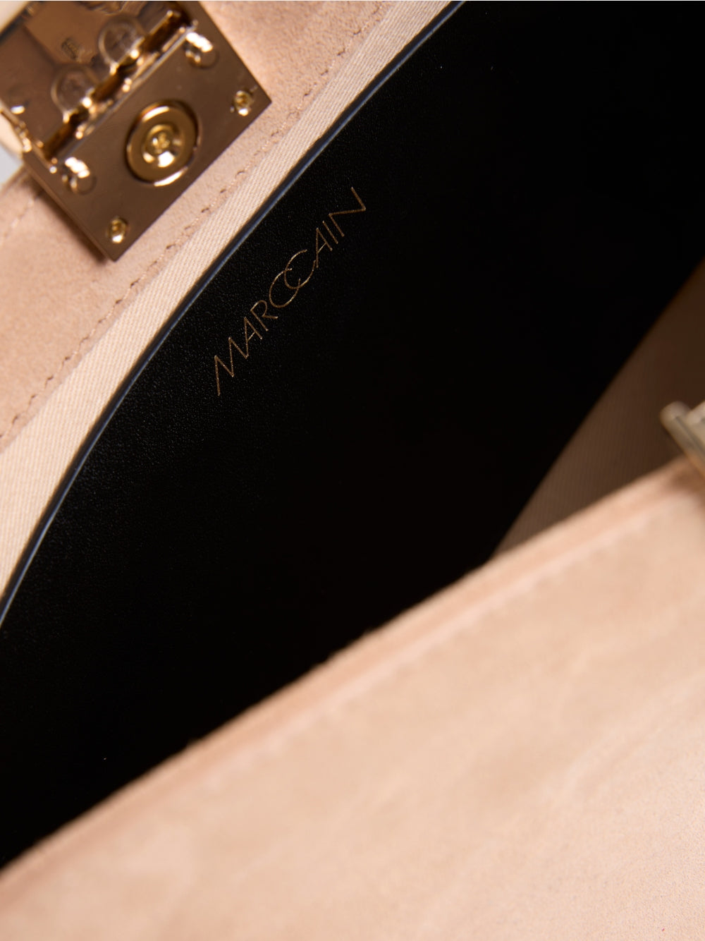 This elegant shoulder bag made of soft calf suede leather captivates with its contrast coloured handle. The handle is decorated with decorative studs, while the buckle that closes the bag adds a stylish highlight with its Marc Cain logo. Ideal for a fashionable yet functional look for everyday use.