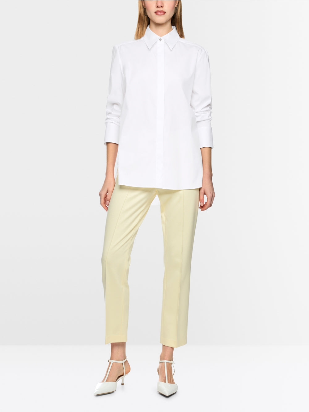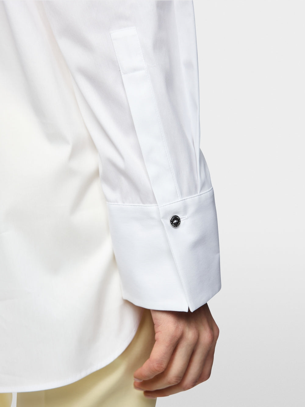 Casually wide shirt blouse made of cotton-based fabric. The model is largely classic in design and features a concealed button placket. Eye-catching details include the glitter stones along the inner edge of the button placket. Pairs well with flowing puddle pants as well as slim bottoms.