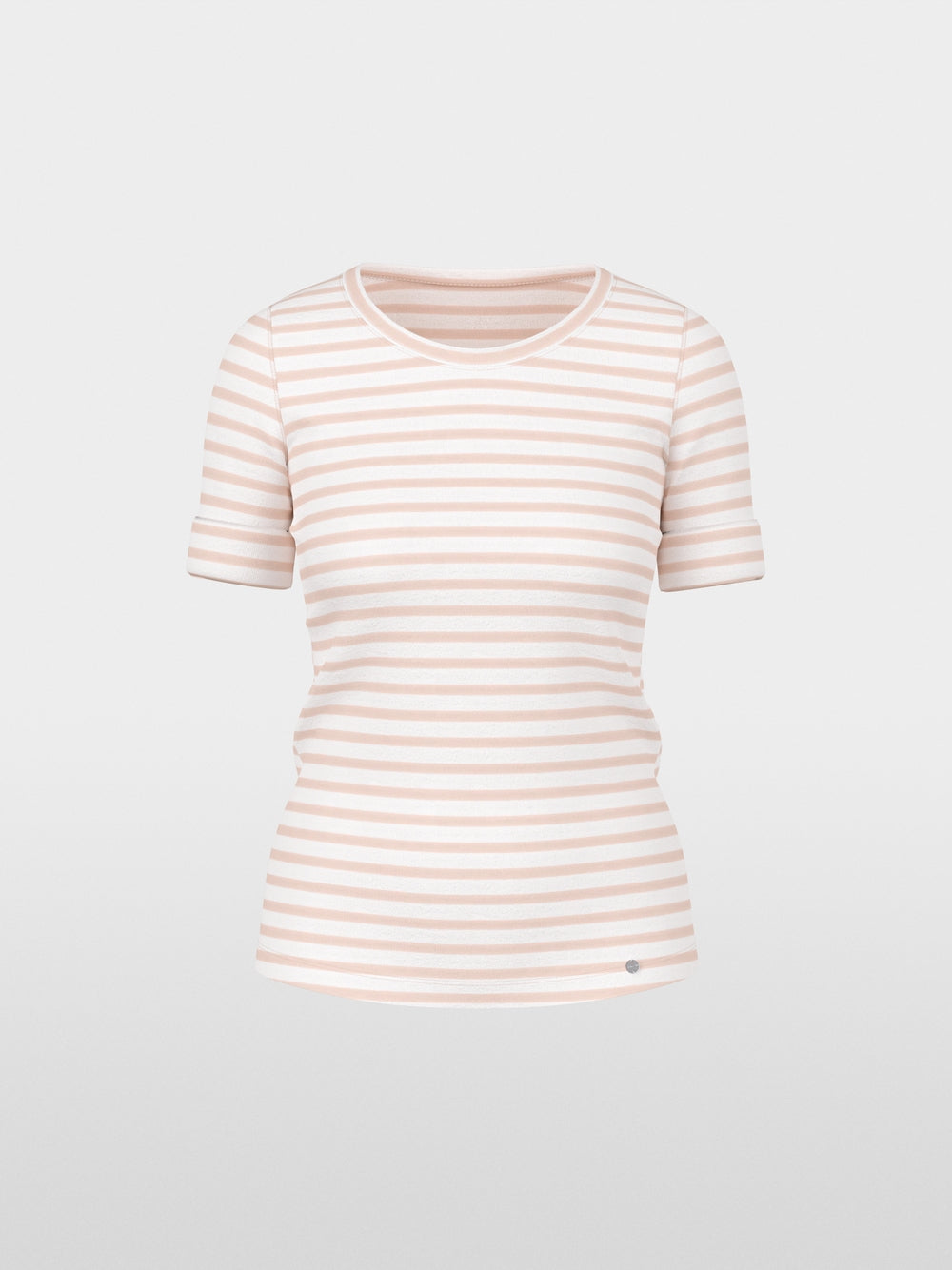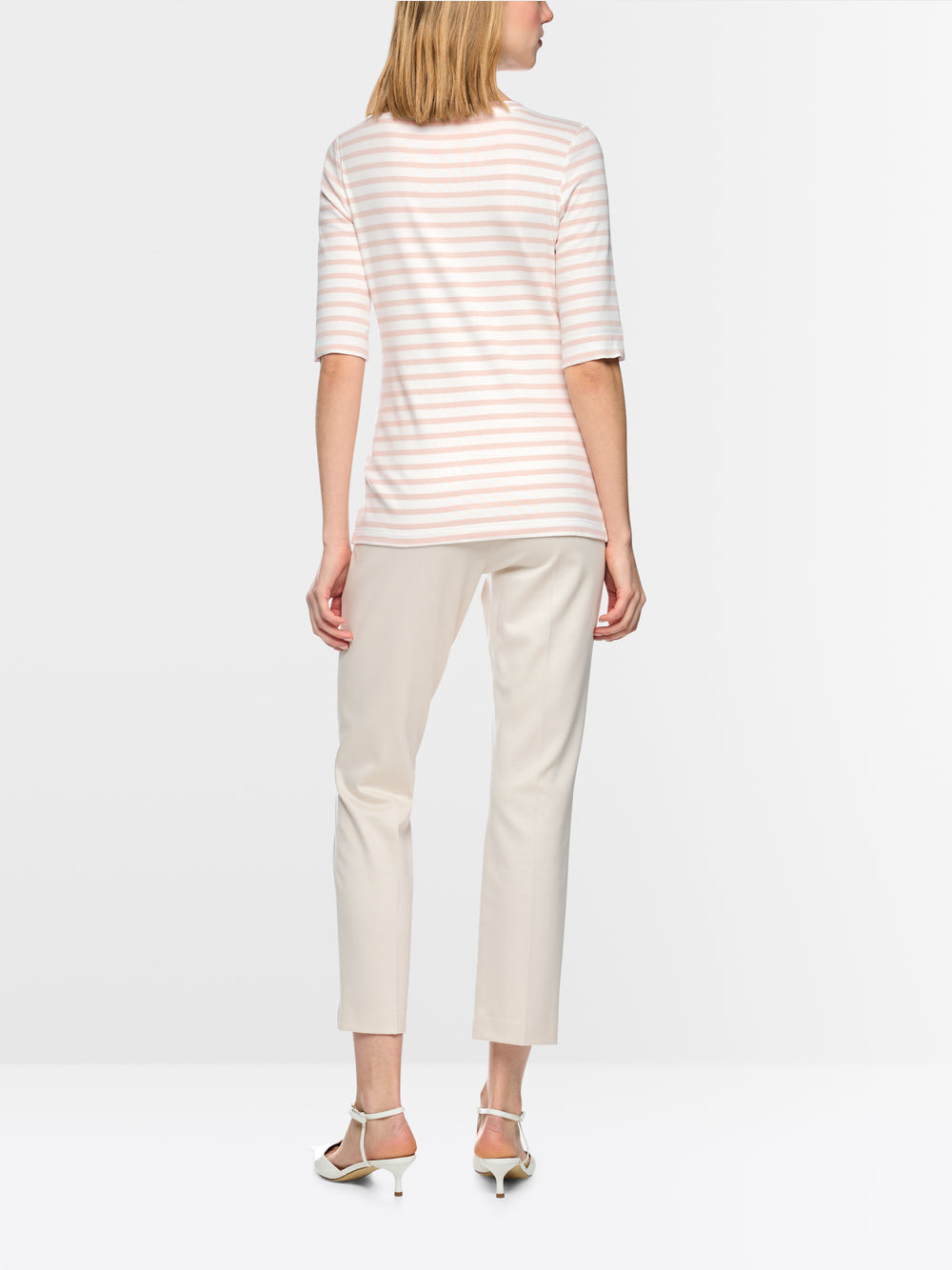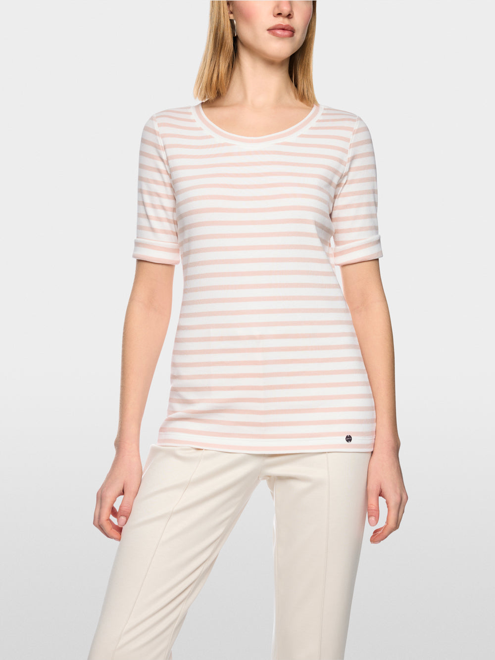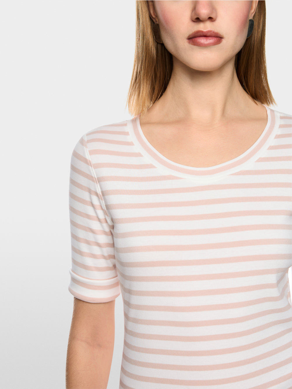 Slim-fit T-shirt made of stretchy cotton rib. The model has a round neckline and 3/4 sleeves. The stripe pattern is all over. A great basic for sporty looks.