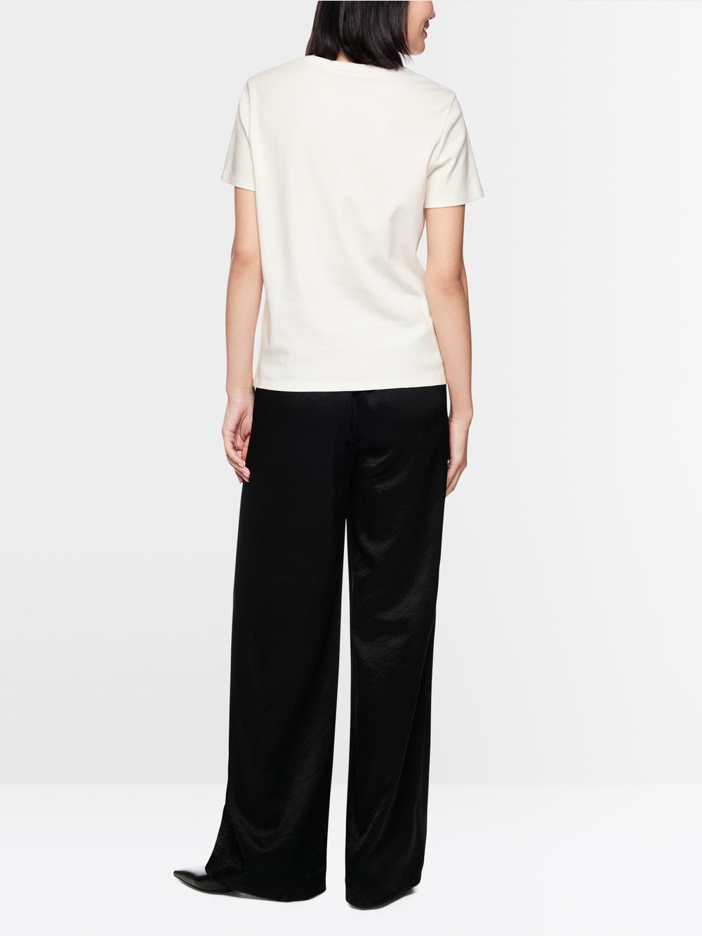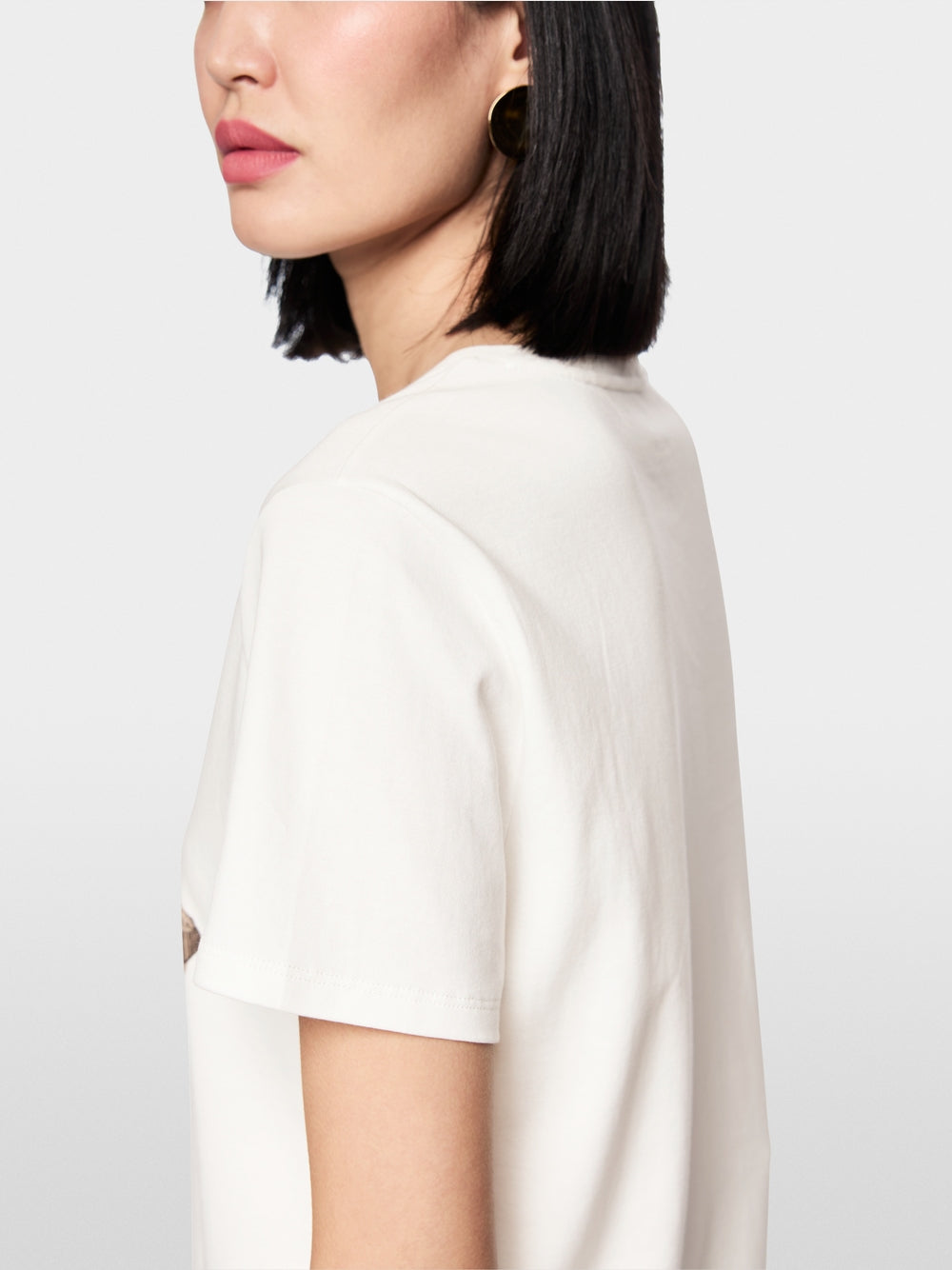 This short-sleeved T-shirt has a round neckline and a slightly fitted cut. The soft cotton material ensures a comfortable fit. The cat print on the front is embellished with sequins and embossed details, giving the shirt a playful, special touch. Ideal for feminine leisure and everyday looks.