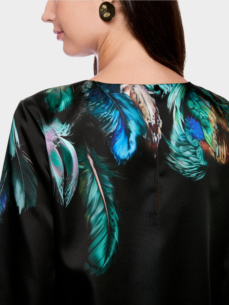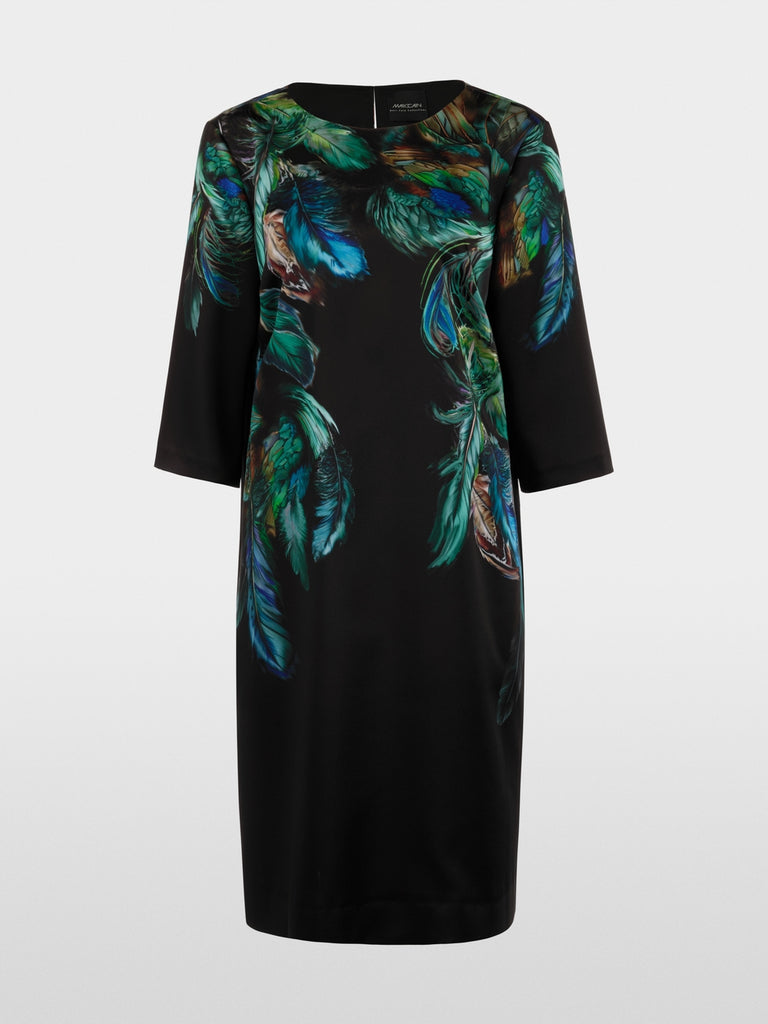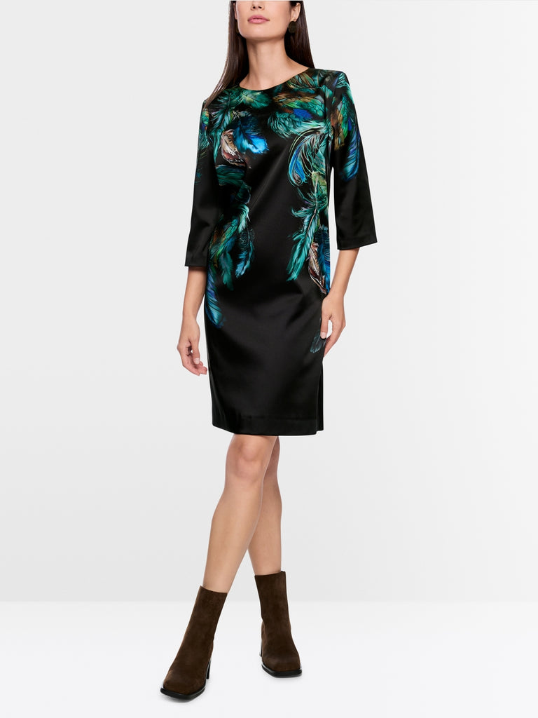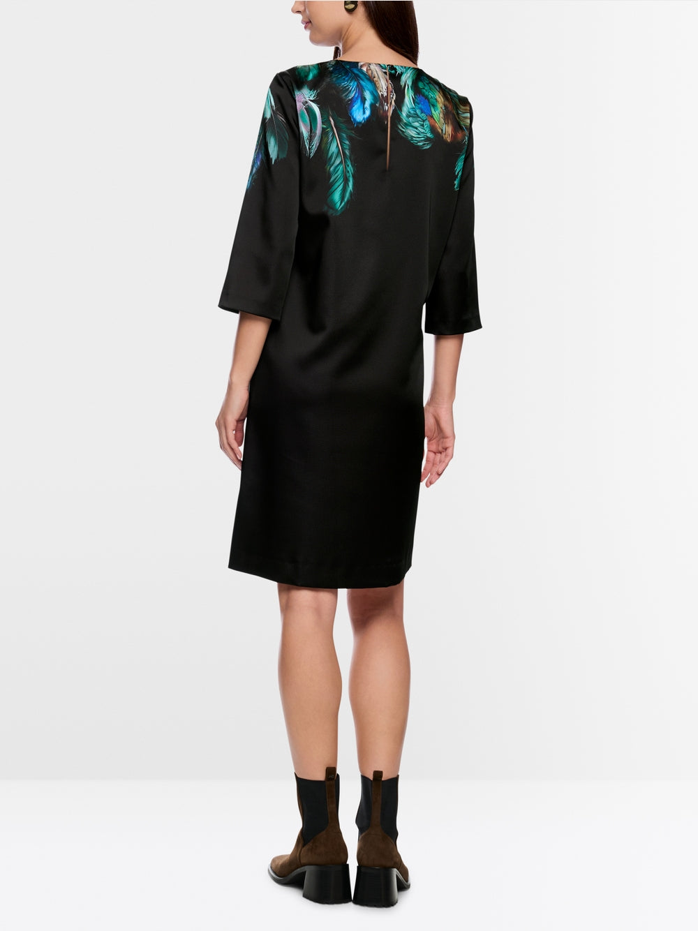 Casual dress with feather print and knee-length hem. The 3/4 sleeves create a modern silhouette, while the soft lining ensures comfort. The slit with the button at the back subtly rounds off the design.