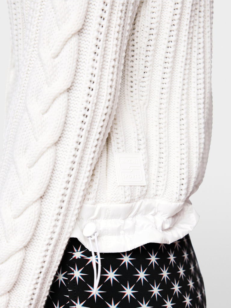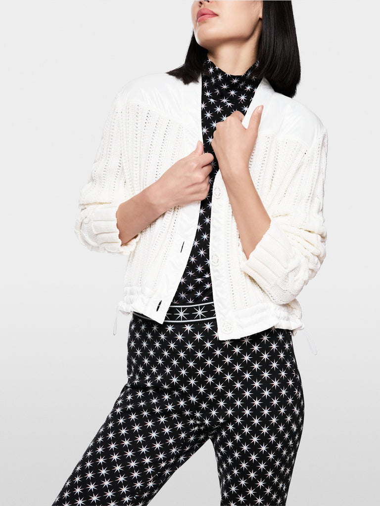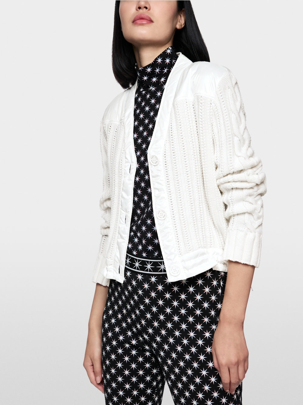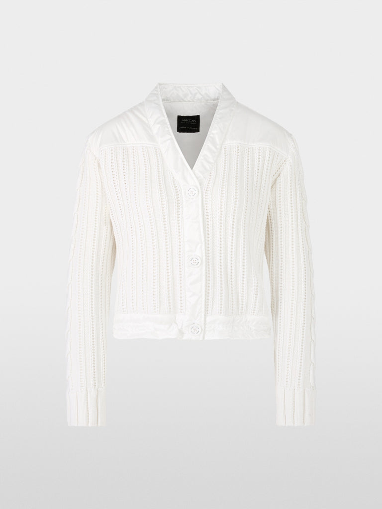 Knitted cardigan made of pure new wool with a special ribbed pattern – knitted and finished in Germany. The individual pieces are further processed at European partner factories. This cardigan is therefore Knitted in Germany. It fastens with three buttons, while the shoulders and hem feature a smooth woven insert, creating a sporty, elegant look. Ideal for modern layering styles.