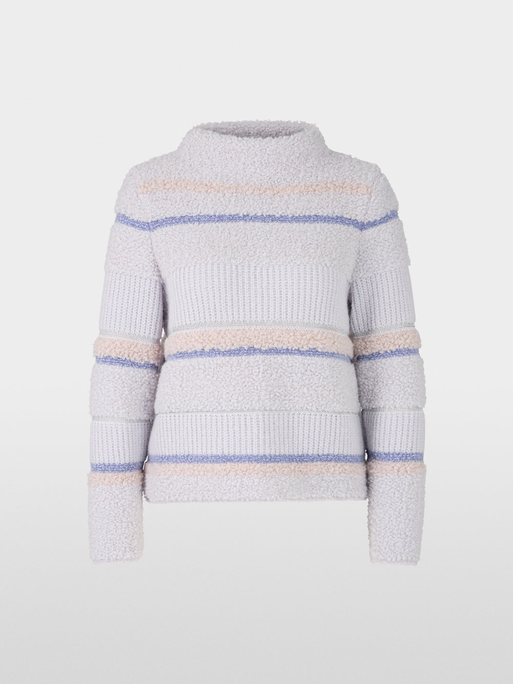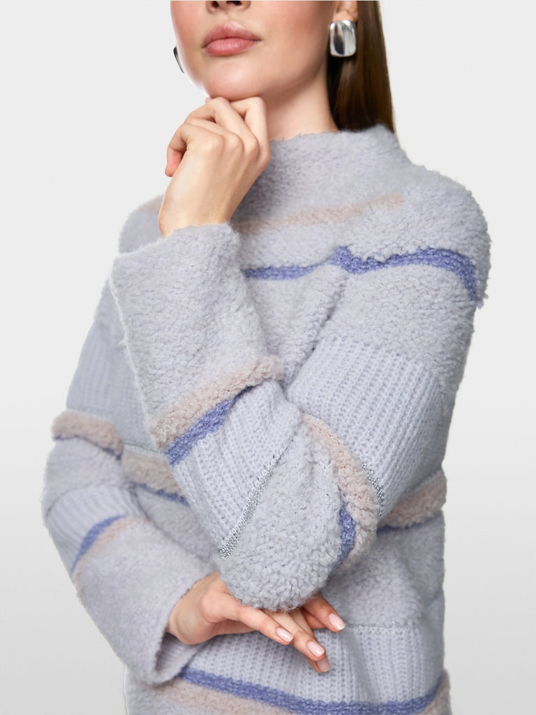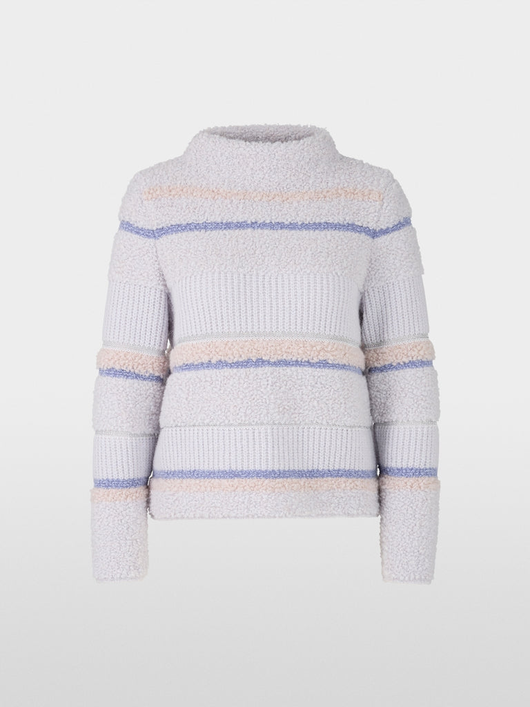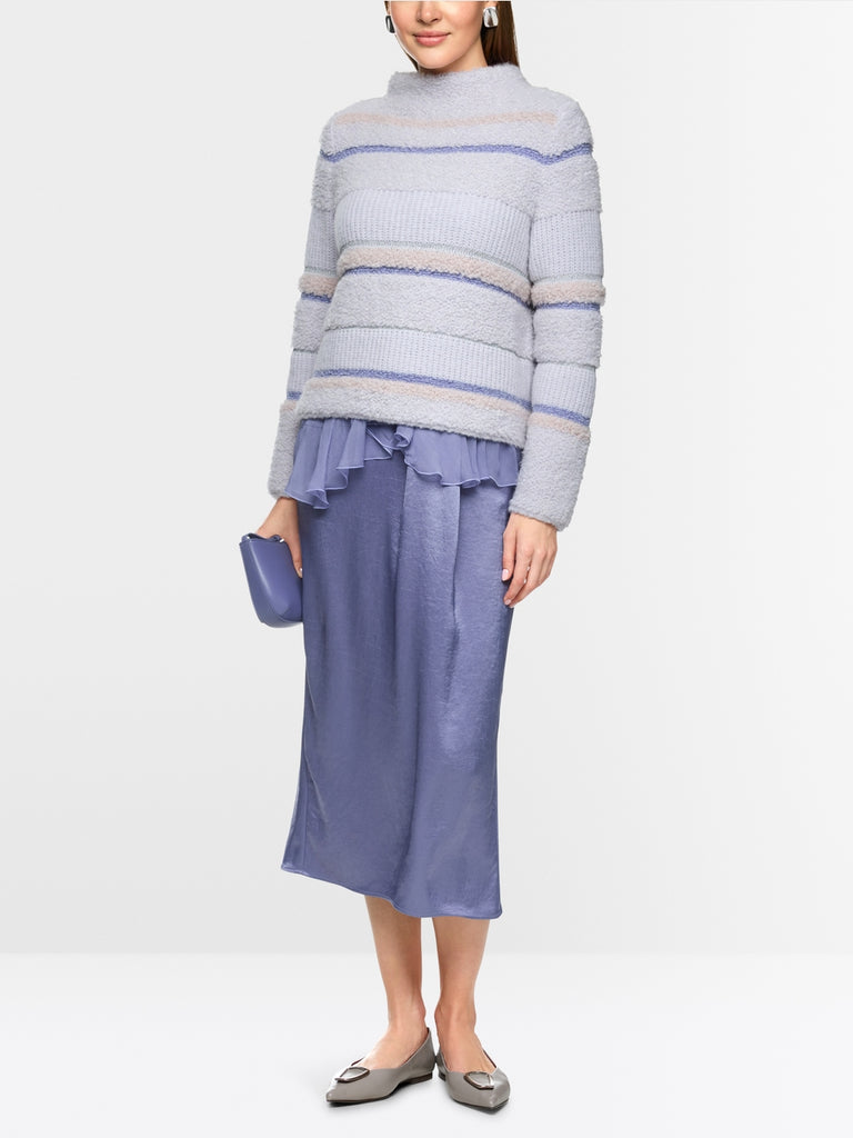 This garment, made from various effect yarns in a striped pattern, has a straight cut and a stand-up collar. This sweater is Knitted in Germany: the yarns are knitted on state-of-the-art knitting machines and the fabrics are finished in Germany. The individual parts, such as the sleeves, front, etc., are sewn together in European partner companies.