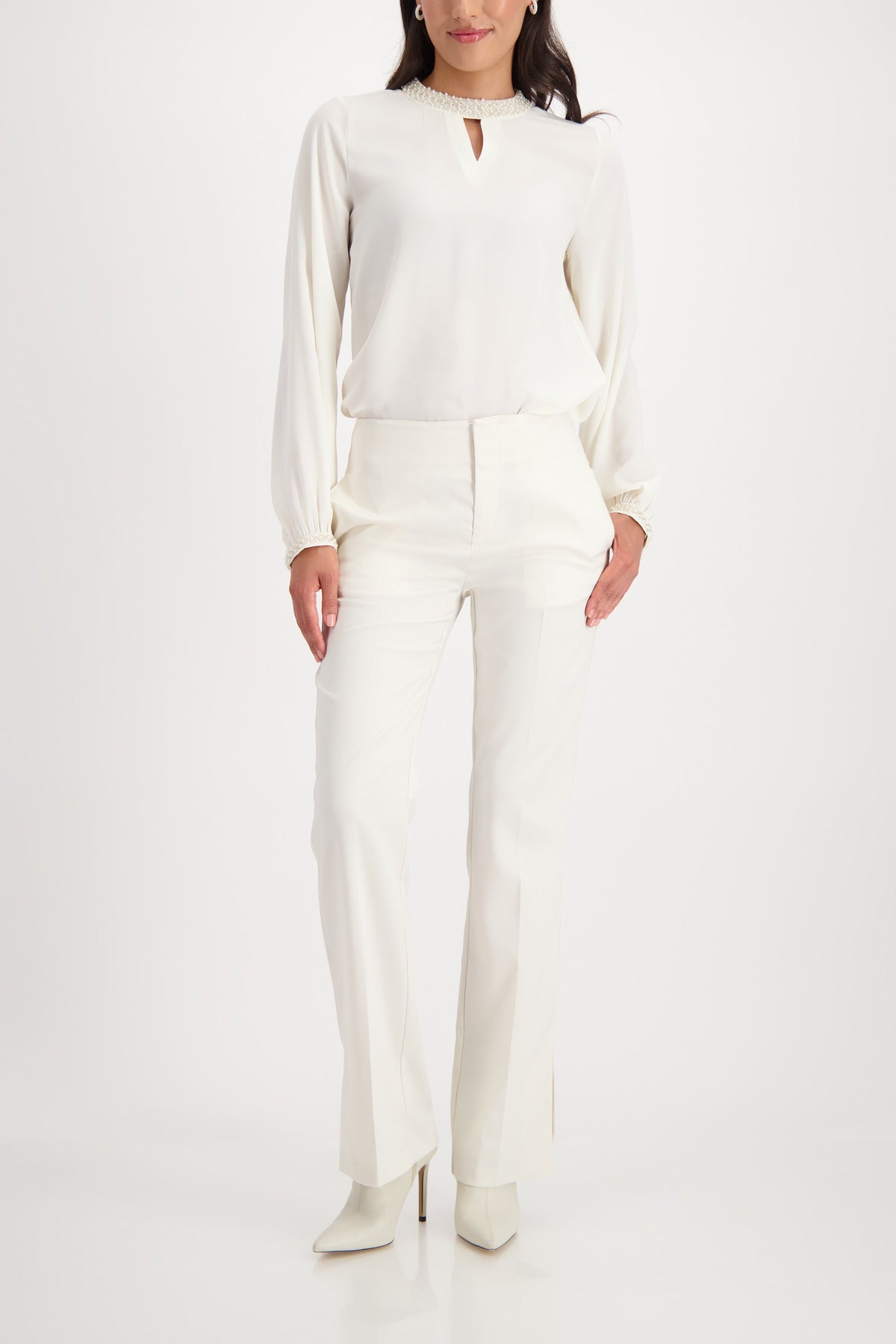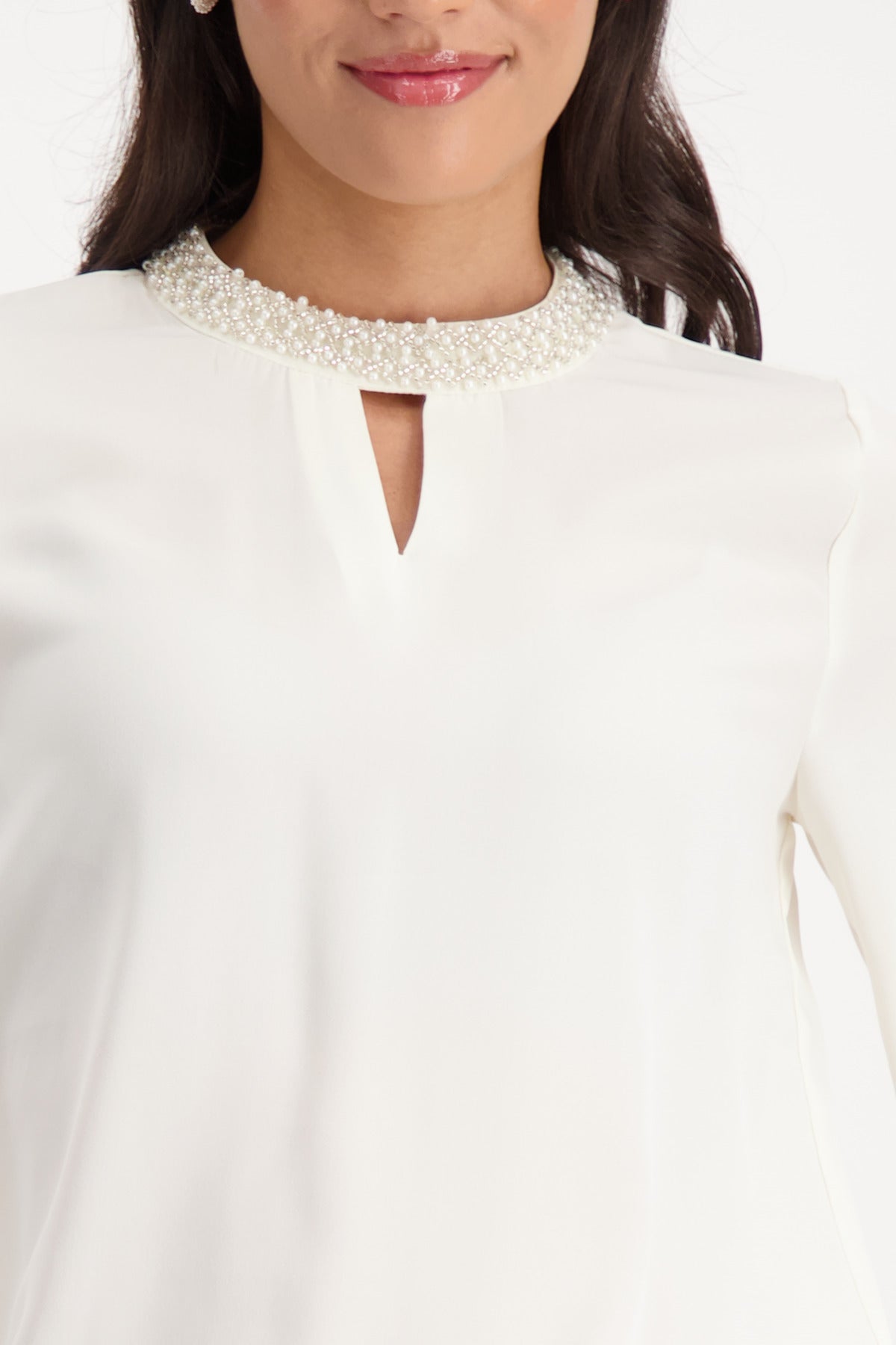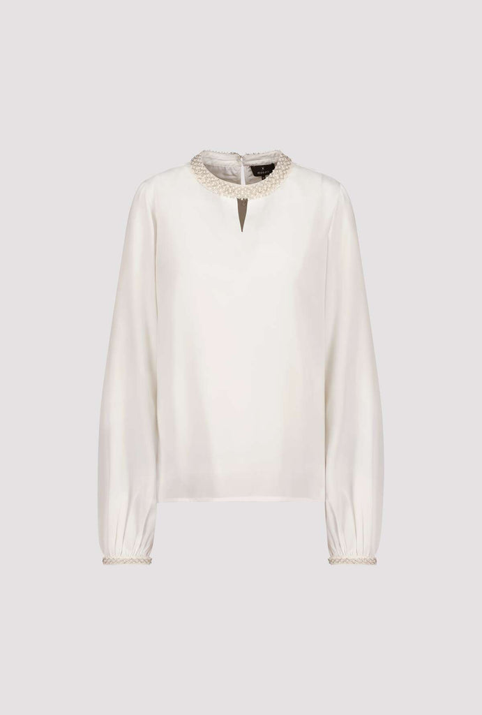 Stylish georgette blouse made from a slightly transparent fabric with jeweled details and ruffled cuffs – an indispensable must-have for modern looks.