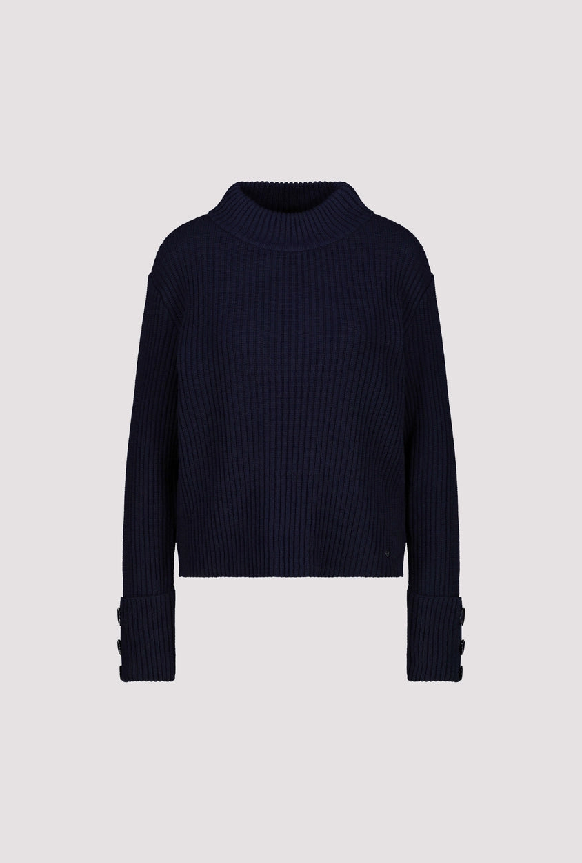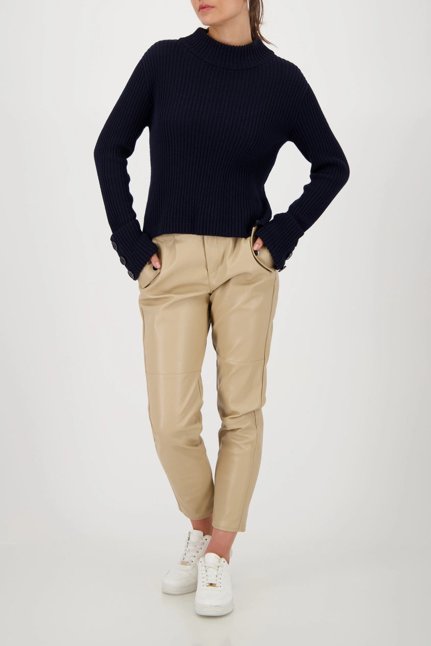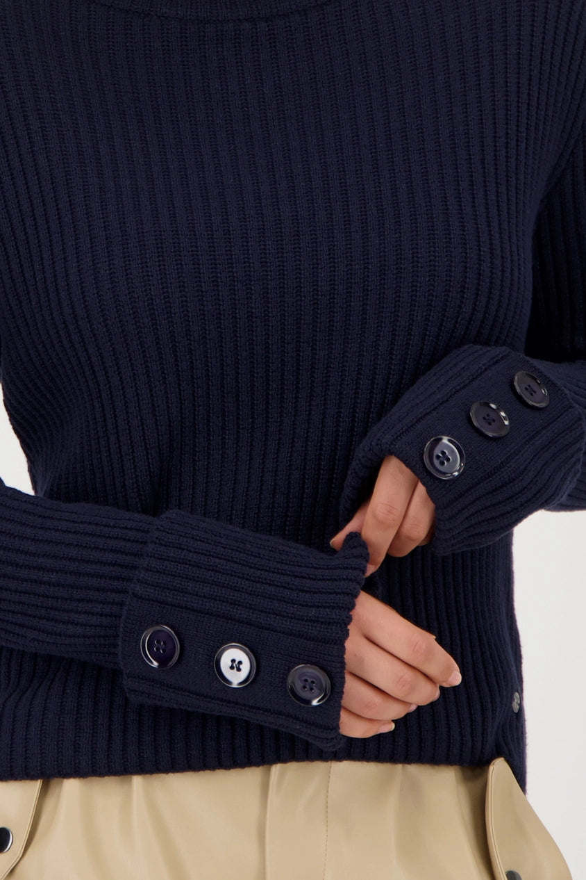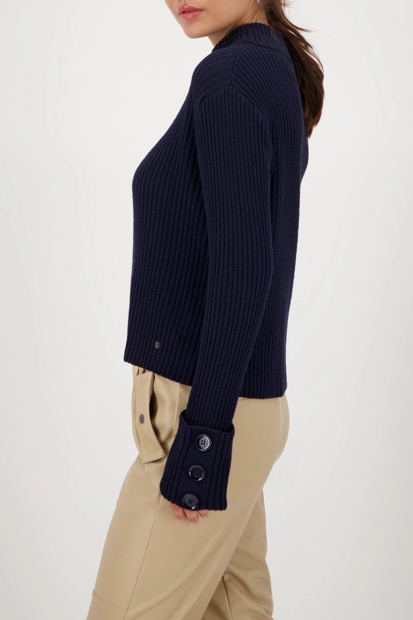Elegant knitted sweater made from a high-quality cotton blend, with ribbed texture, stand-up collar and wide, button-decorated sleeves for stylish accents.