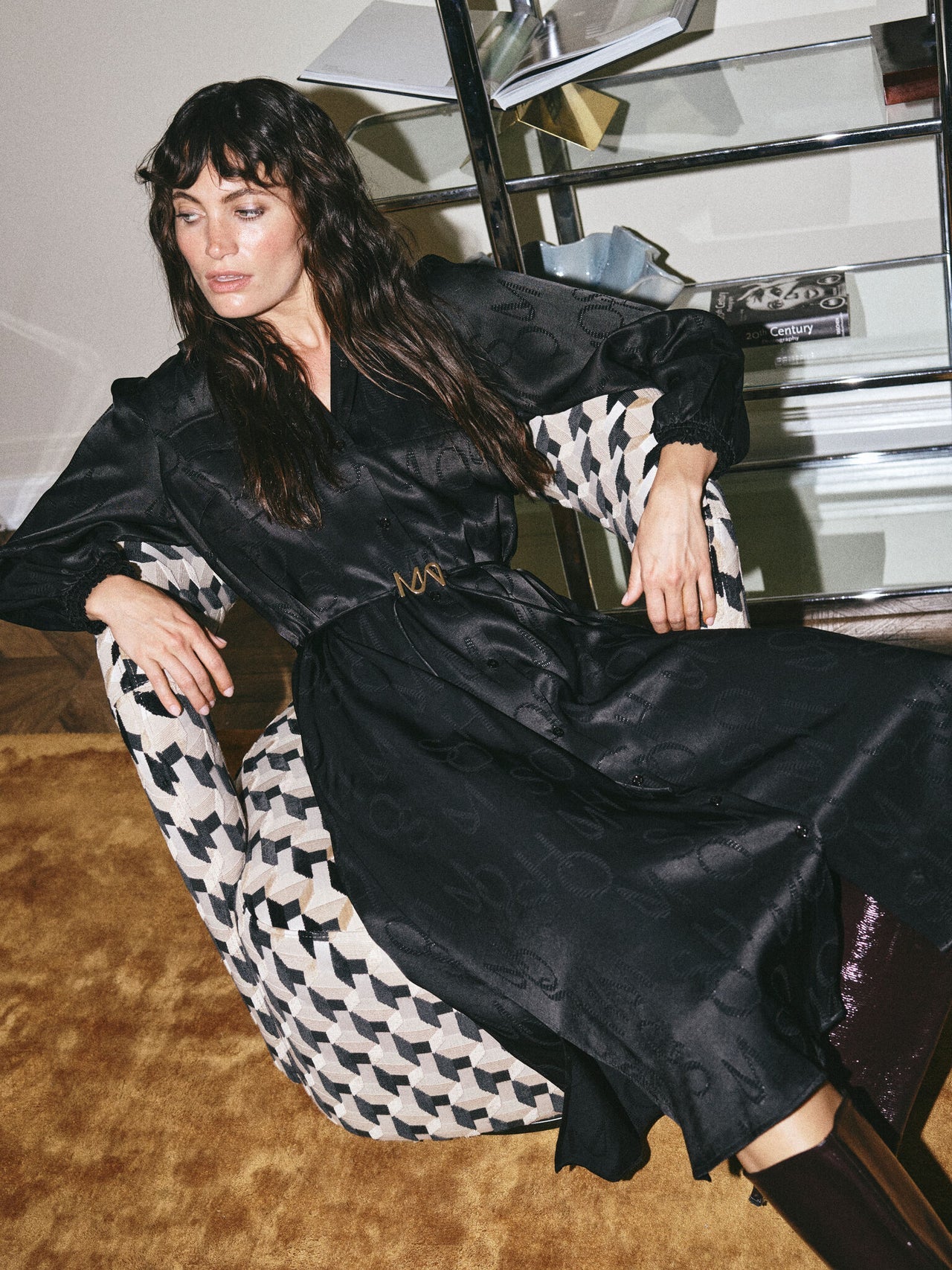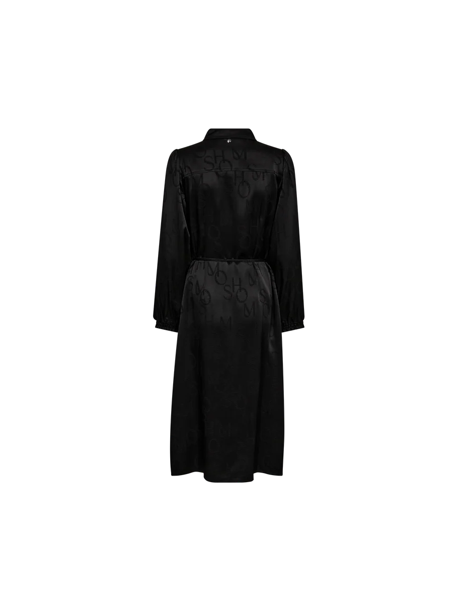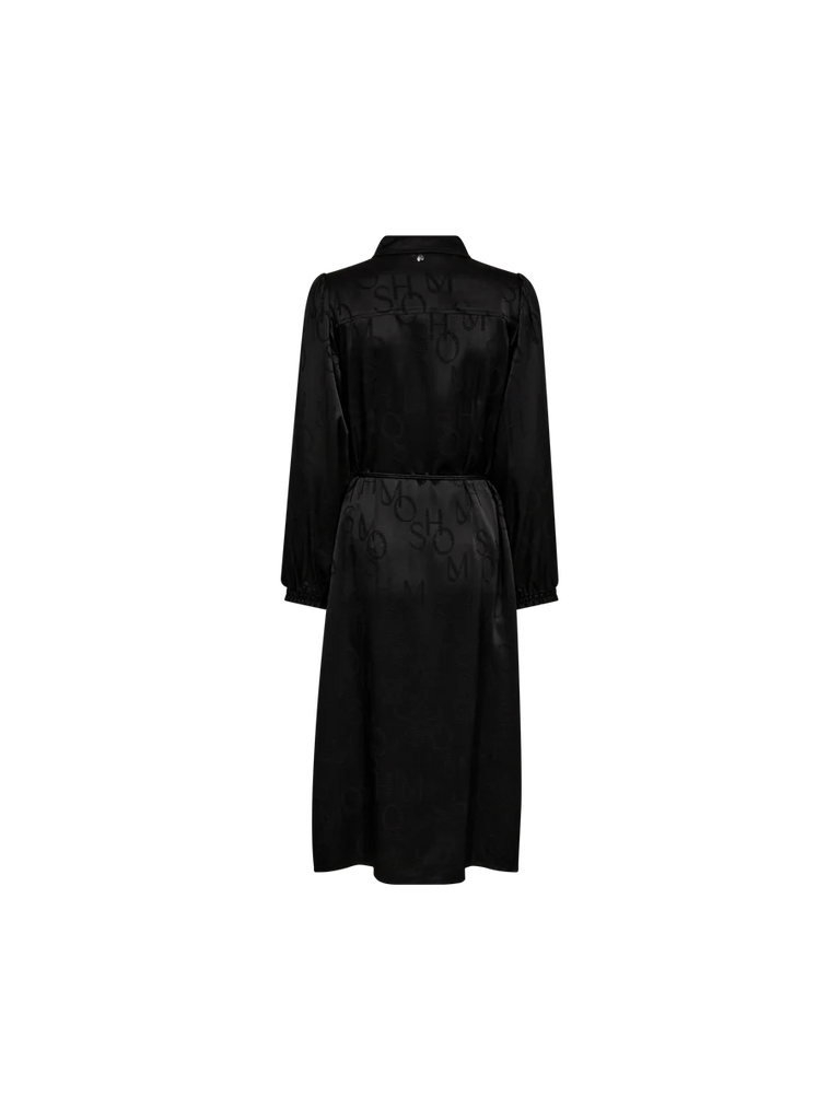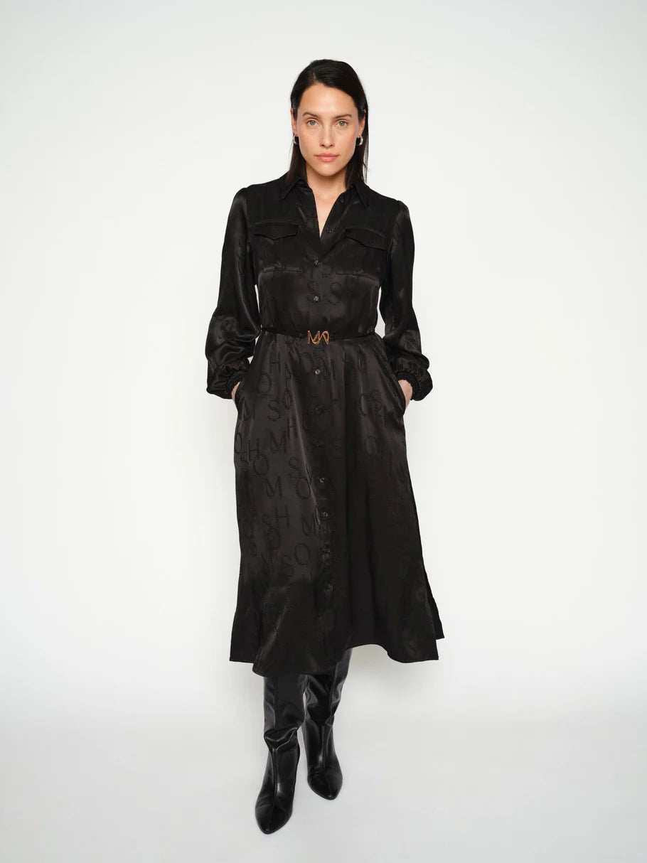 This shirt dress is the definition of understated elegance. Crafted in a soft, glossy fabric with tonal monogram detailing, it features a classic collar, button-down front, and flap chest pockets for a utility-inspired edge. The silhouette is beautifully cinched with a slim belt adorned with a shiny gold MOS MOSH buckle — subtly highlighting the waist. Style it with boots for a sleek day-to-night look or layer under a tailored blazer for extra polish. A timeless piece with unmistakable MOS MOSH character.