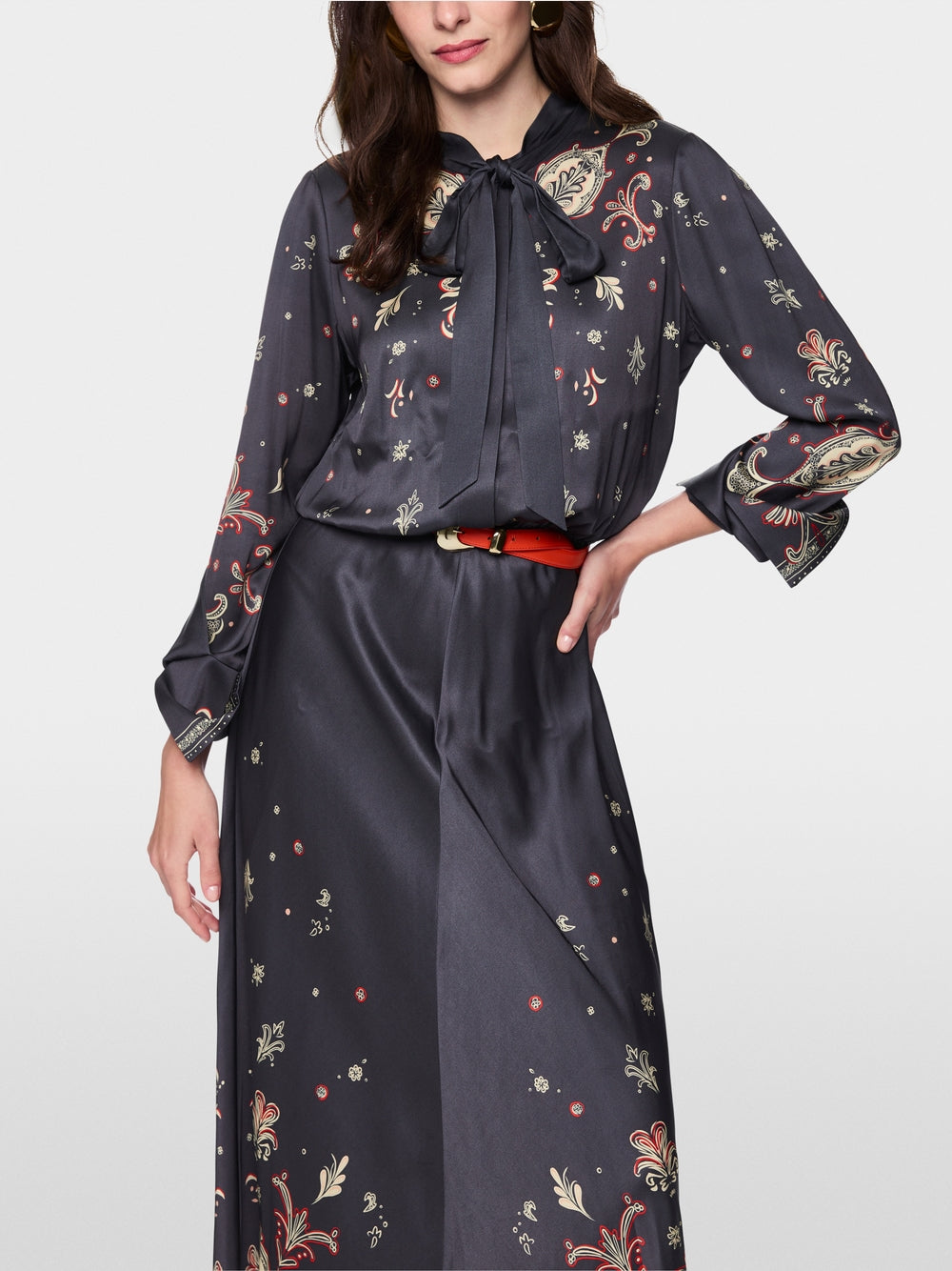 Long dress made from flowing viscose with an elegant paisley pattern. The swinging skirt and slit sleeves create a sense of lightness, while the bow and concealed buttoning add sophisticated details. A narrow elasticated band emphasises the waist, while the lack of lining ensures lightness.