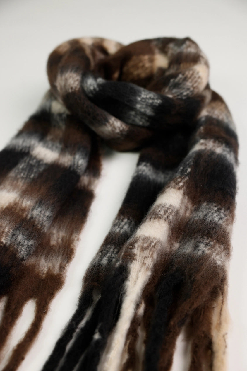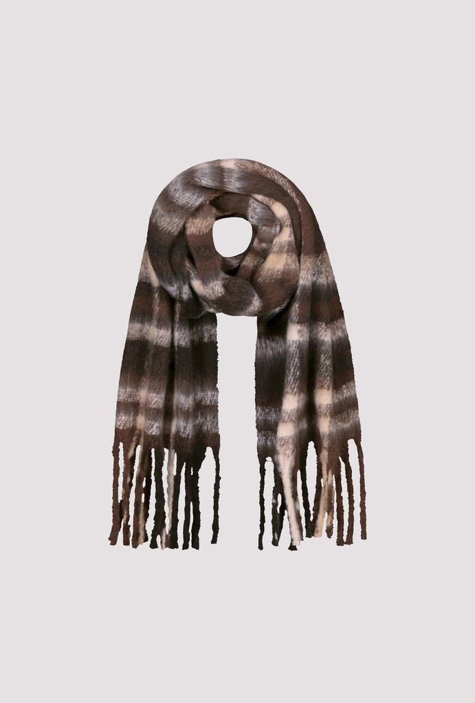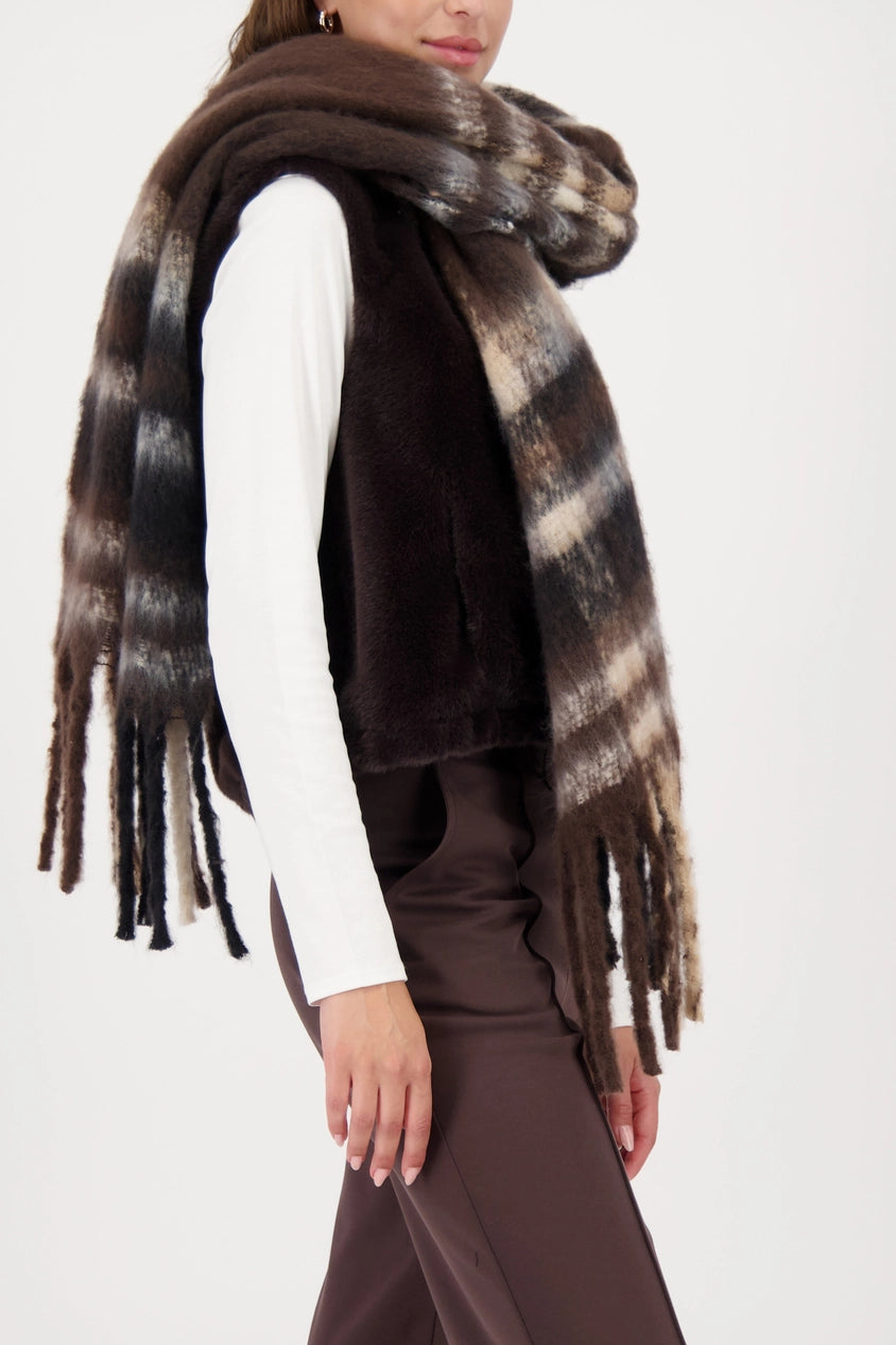 This fluffy scarf with frayed ends and a check pattern not only offers great comfort but also a trendy look.