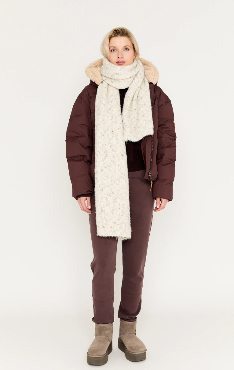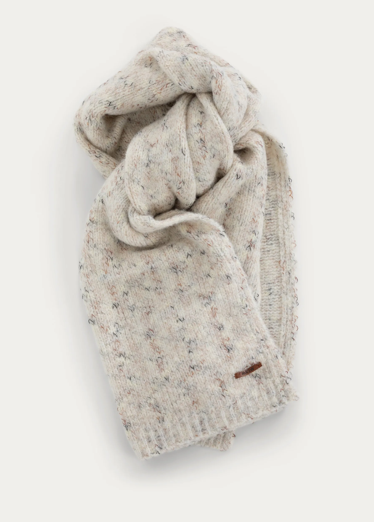 This off-white knitted scarf from Moscow is a soft and warm essential for your winter wardrobe. Made from a comfortable blend including wool and alpaca, it's perfect for colder days. The mélange texture adds visual depth and a natural look. Its elongated shape allows for various styling options—draped loosely or wrapped snugly. Pair it with matching accessories for a coordinated outfit.