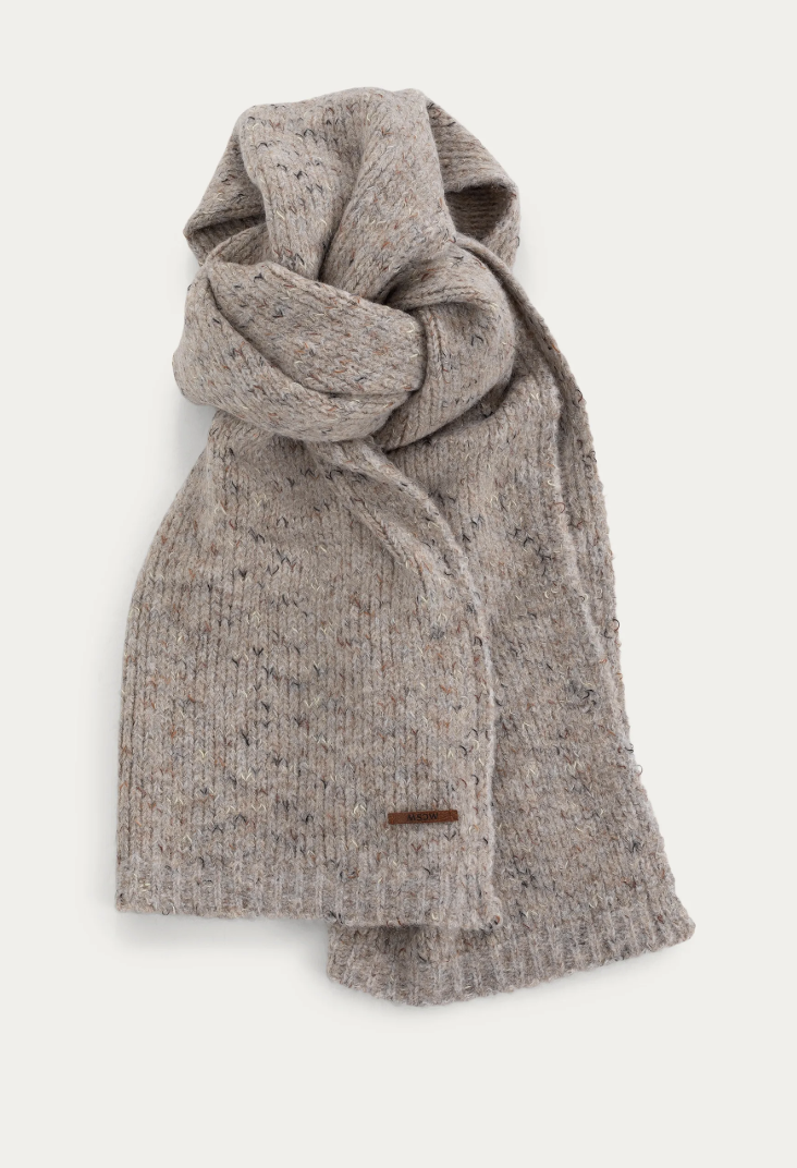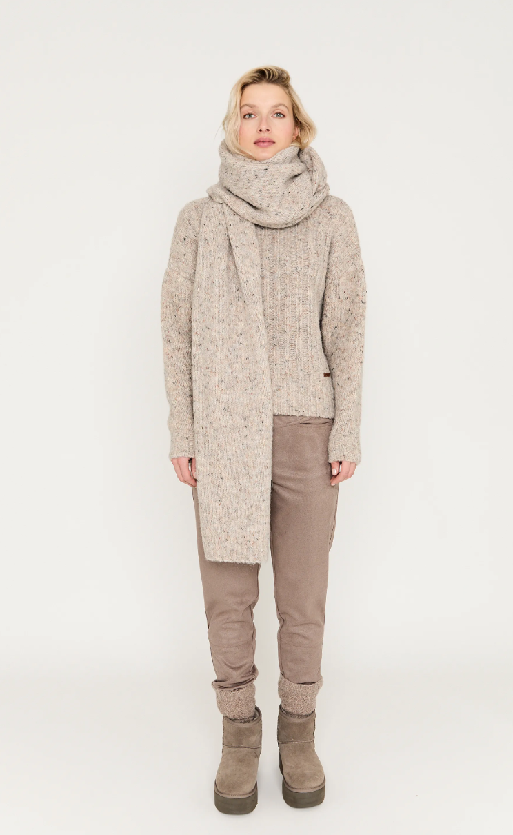 This taupe knitted scarf from Moscow is a cozy and warm addition to your winter wardrobe. Made from a soft blend including wool and alpaca, it feels comfortable and insulating on cold days. The mélange texture adds subtle depth and a natural look. Its elongated shape allows for multiple styling options. Pair it with matching accessories for a coordinated winter set.