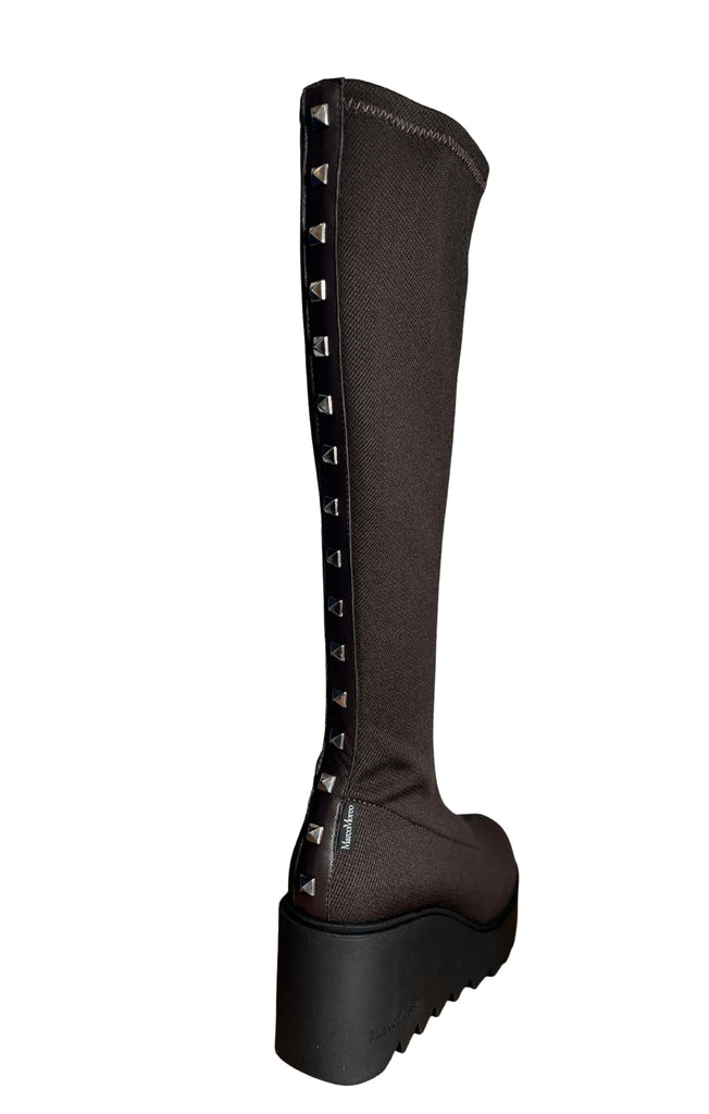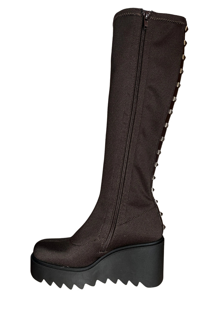 Wedge Knee Length Boot with Studs - Brown