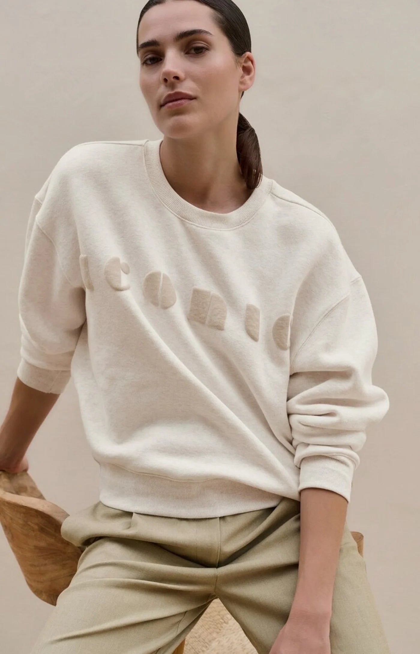 This soft sweater features a classic round neck, long sleeves, and ribbed cuffs. Made from a comfortable sweat fabric, it is detailed with a playful artwork design on the front. The oversized fit and cozy finish make it a perfect everyday piece for a casual and relaxed look.