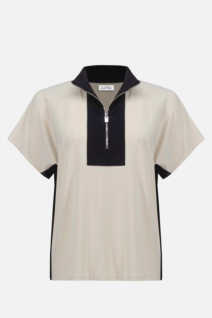 This silky knit top brings a sporty edge to clean lines, featuring a zipped stand collar and short dolman sleeves. The contrast collar and placket deliver a bold finish to the colour block design.