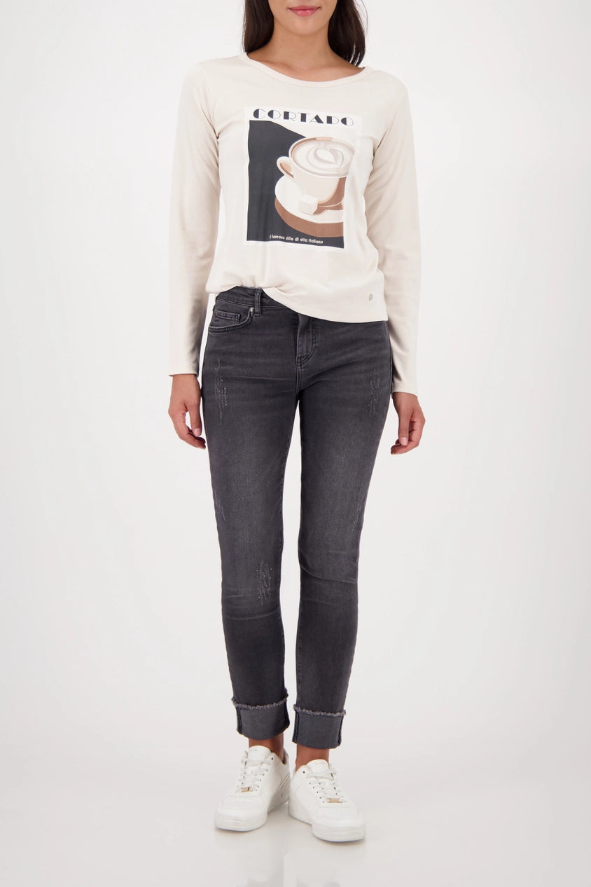 This stylish long-sleeved shirt made of 100% cotton features a cappuccino print and sparkling rhinestones.