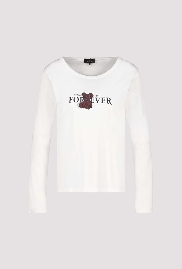 This elegant long-sleeved shirt made of 100% cotton enchants with a teddy bear print, rhinestones, and the inspiring "Always and forever" lettering.