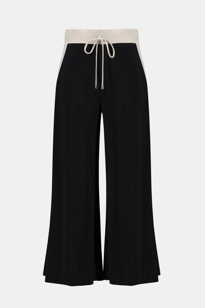 Designed with movement in mind, these silky knit pants feature a bold color block design and a wide leg cut. The covered elastic waistband includes a drawstring with JR cord ends, while side inserts with small slits offer extra ease.