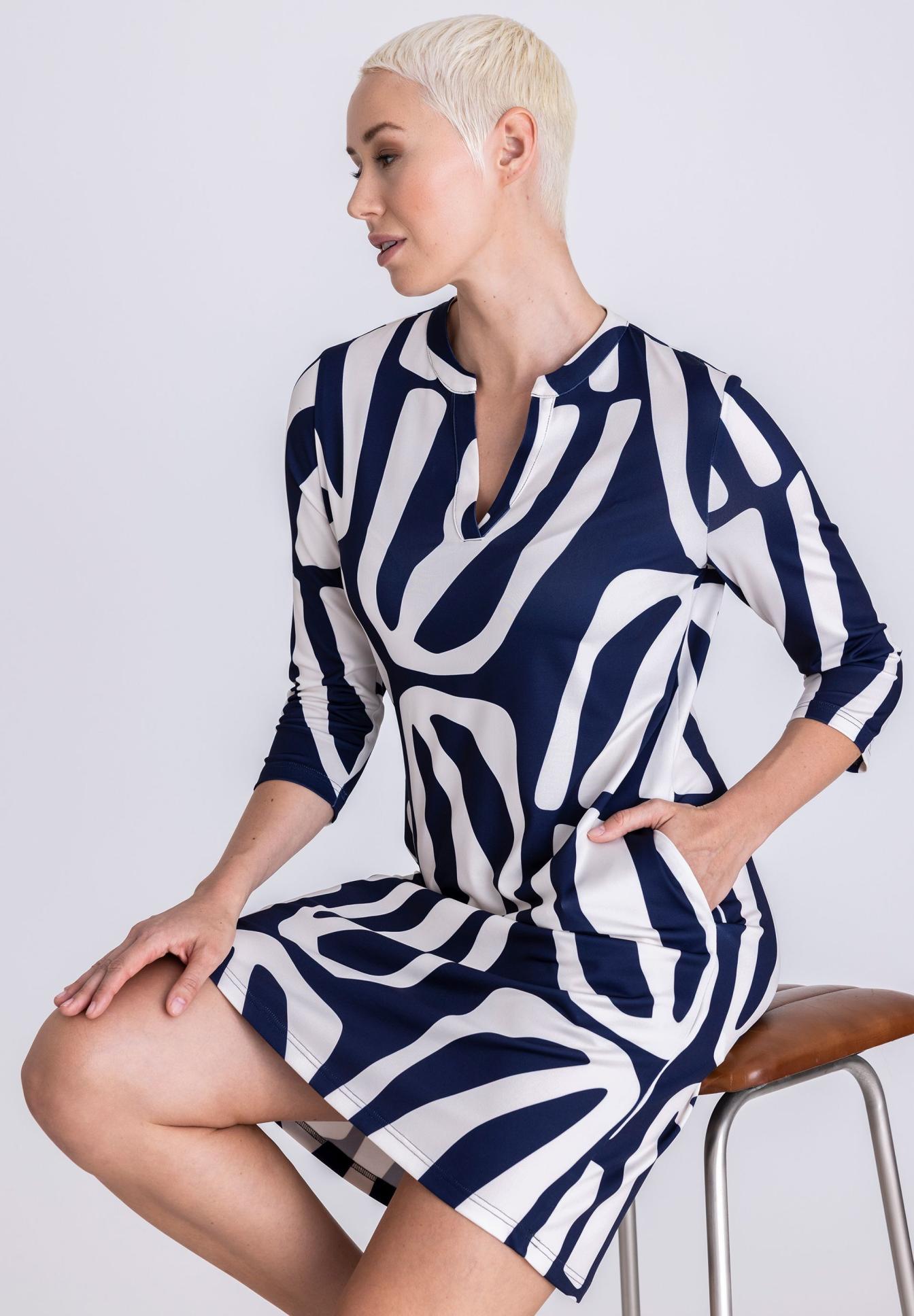 Straight dress with graphic pattern and 3/4 sleeves, slit at the front neckline.