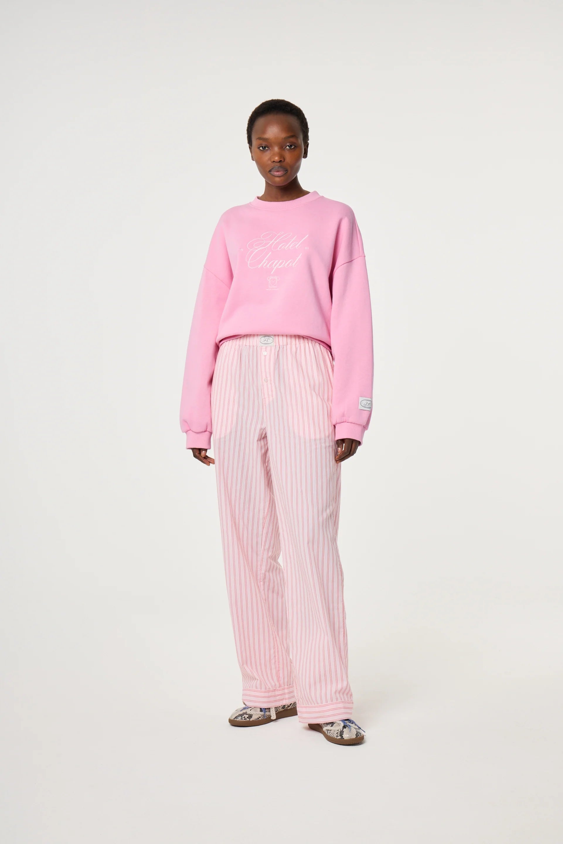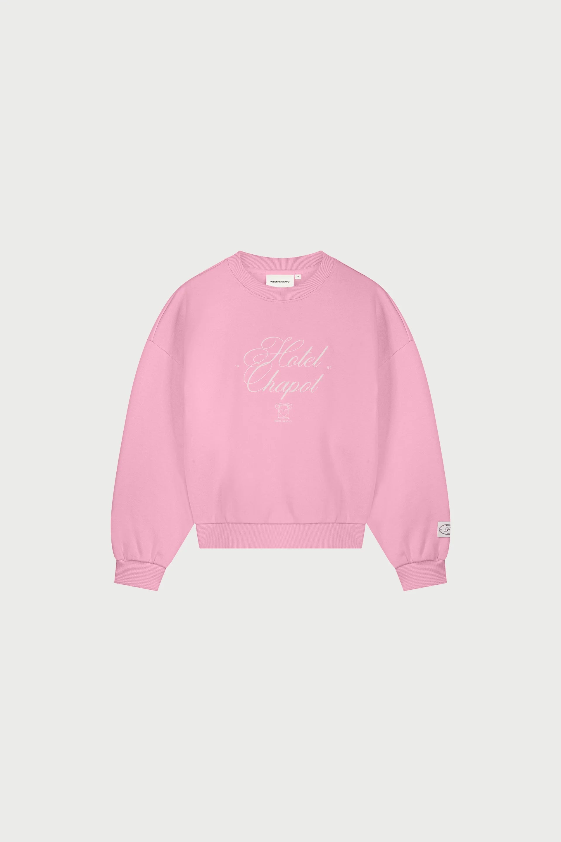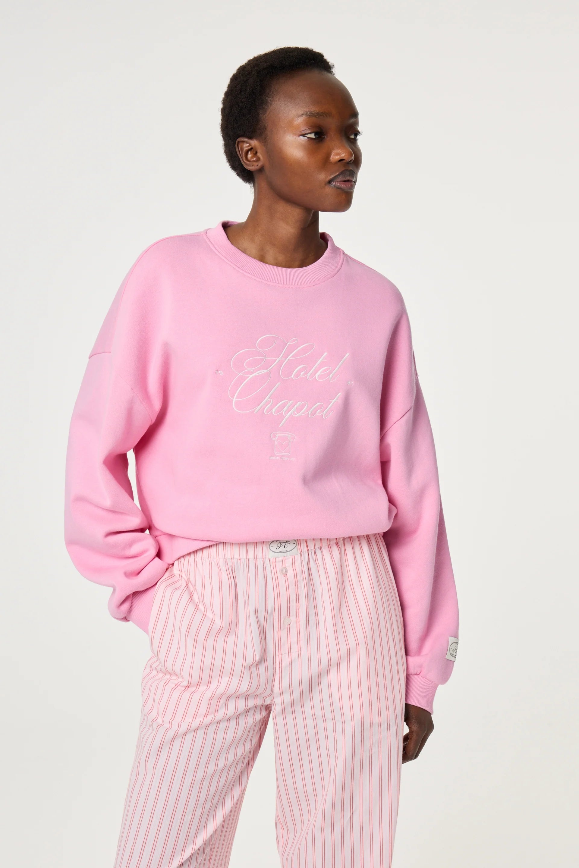 This soft pink sweater features the playful Hotel Chapot design for a fun, standout look. Crafted from organic cotton, it offers a soft, cozy feel and a relaxed, loose fit. Perfect for casual days, layering, or adding a cheerful touch to your everyday wardrobe.