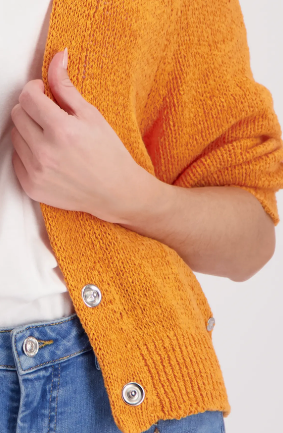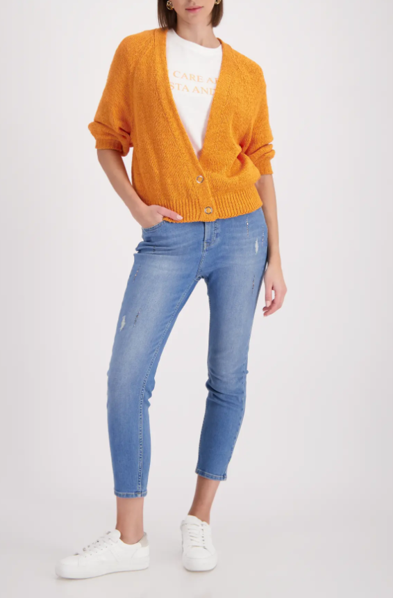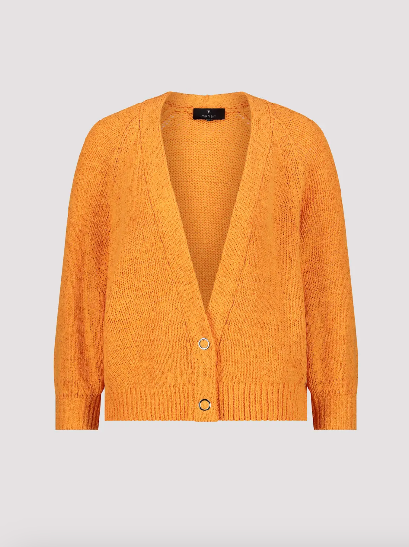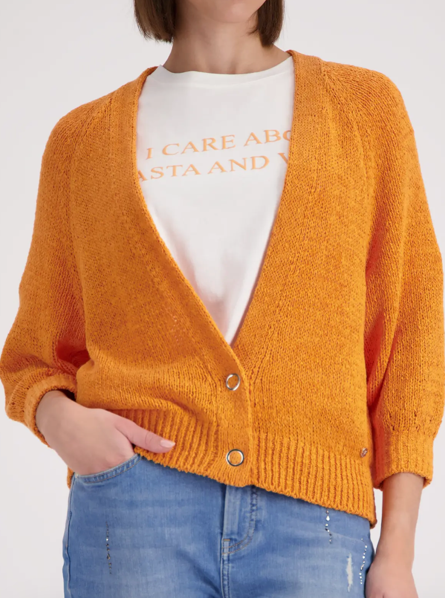 Stylish cardigan made of high-quality cotton with a V-neck and ⅞ sleeves, adorned with elegantly ribbed cuffs.