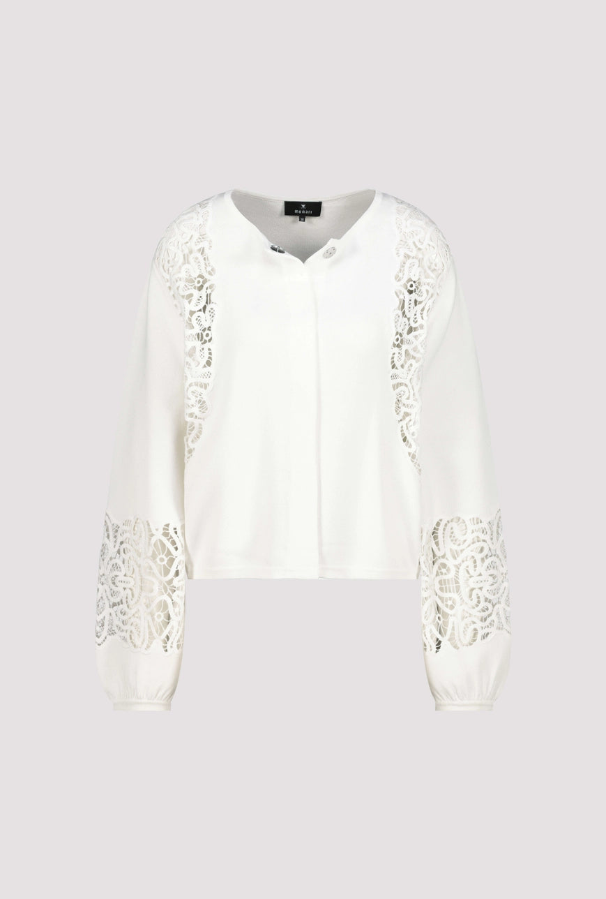 Elegant cardigan made of a flowing viscose, featuring lace inserts and ruffled sleeve hems – modern and stylish for any occasion.