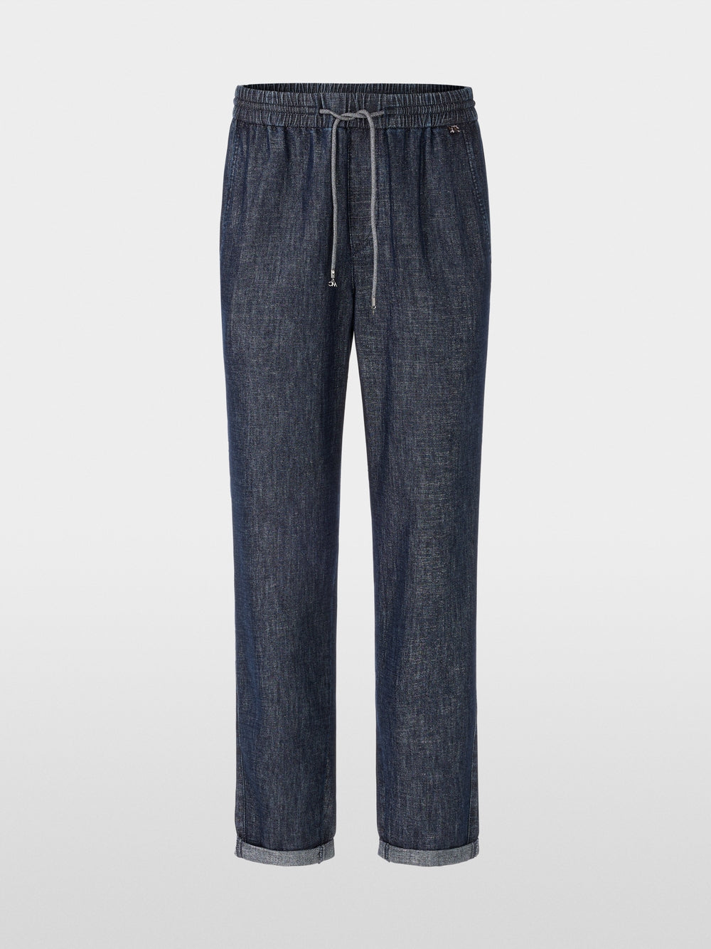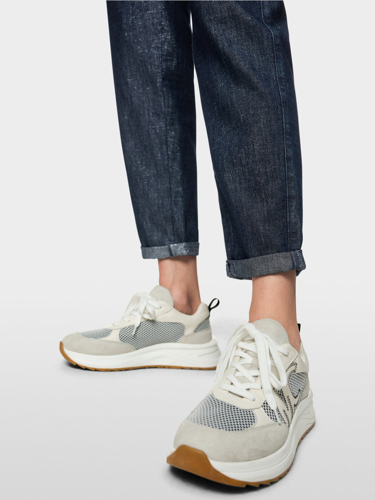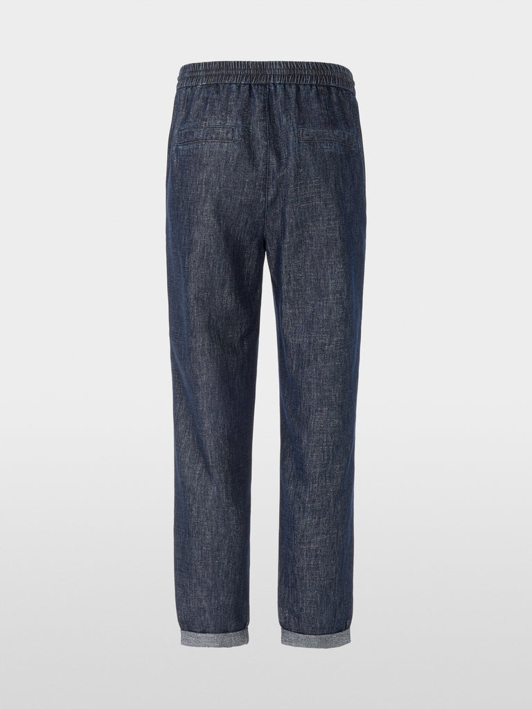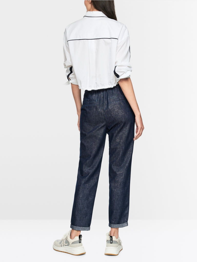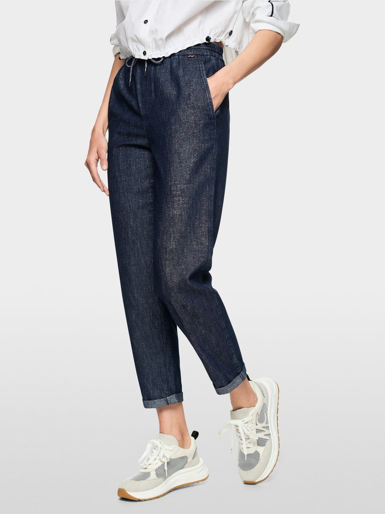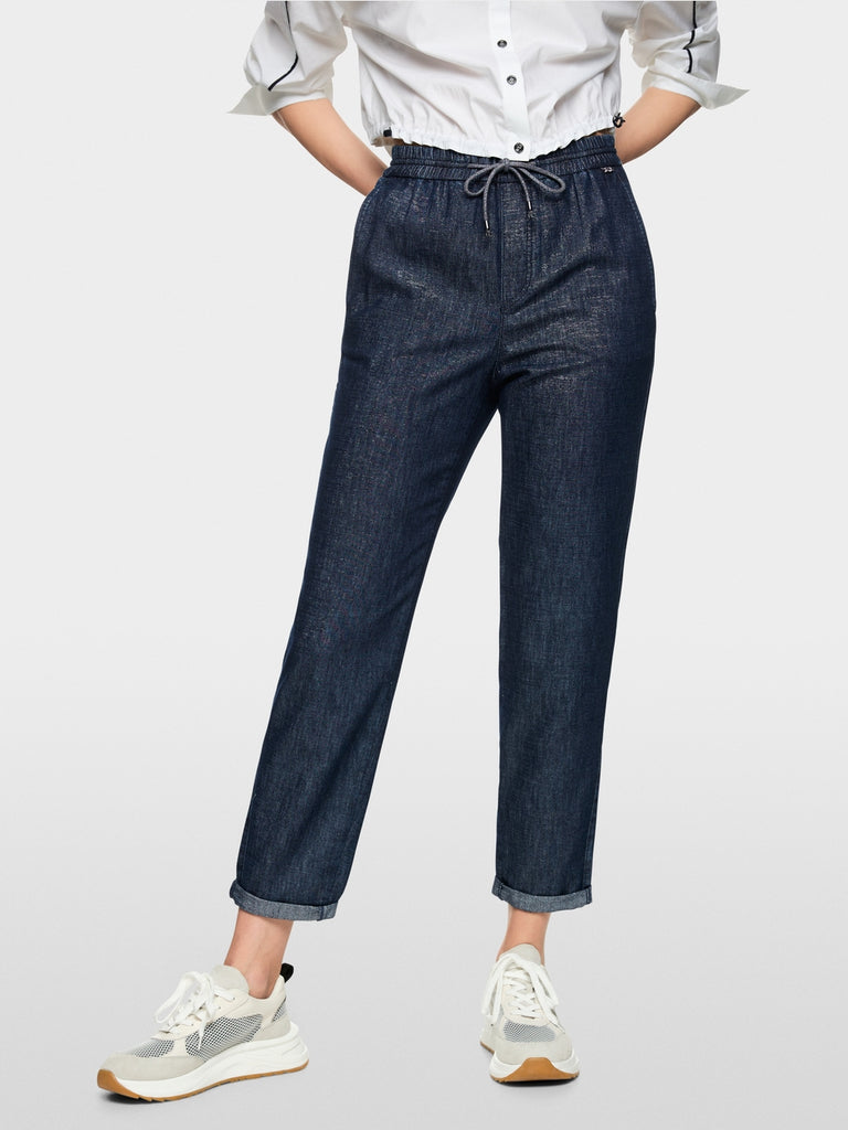 These loose-fitting jeans are perfect for summer. They have a relaxed cut and 7/8-length legs with turn-ups. The side pockets and elasticated waistband complement the comfortable style. The glittery drawstring on these jeans is another chic highlight.