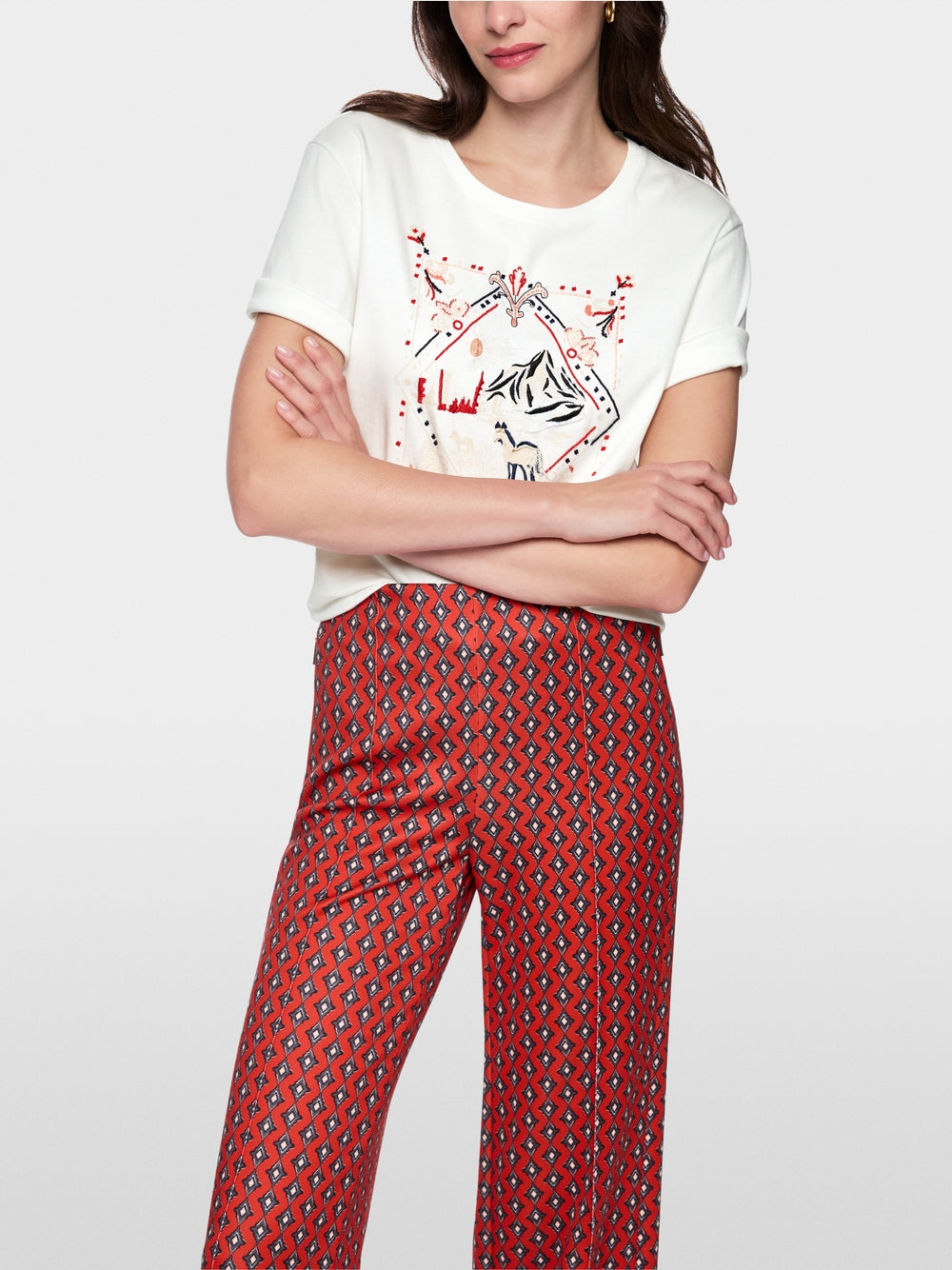 Loose-fitting cotton T-shirt with artistic motif including embroidery, mini beads and small fringes on the front. The classic round neckline and short, fitted sleeves ensure a casual, comfortable fit. A stylish basic for everyday wear and leisure which perfectly combines comfort and design.