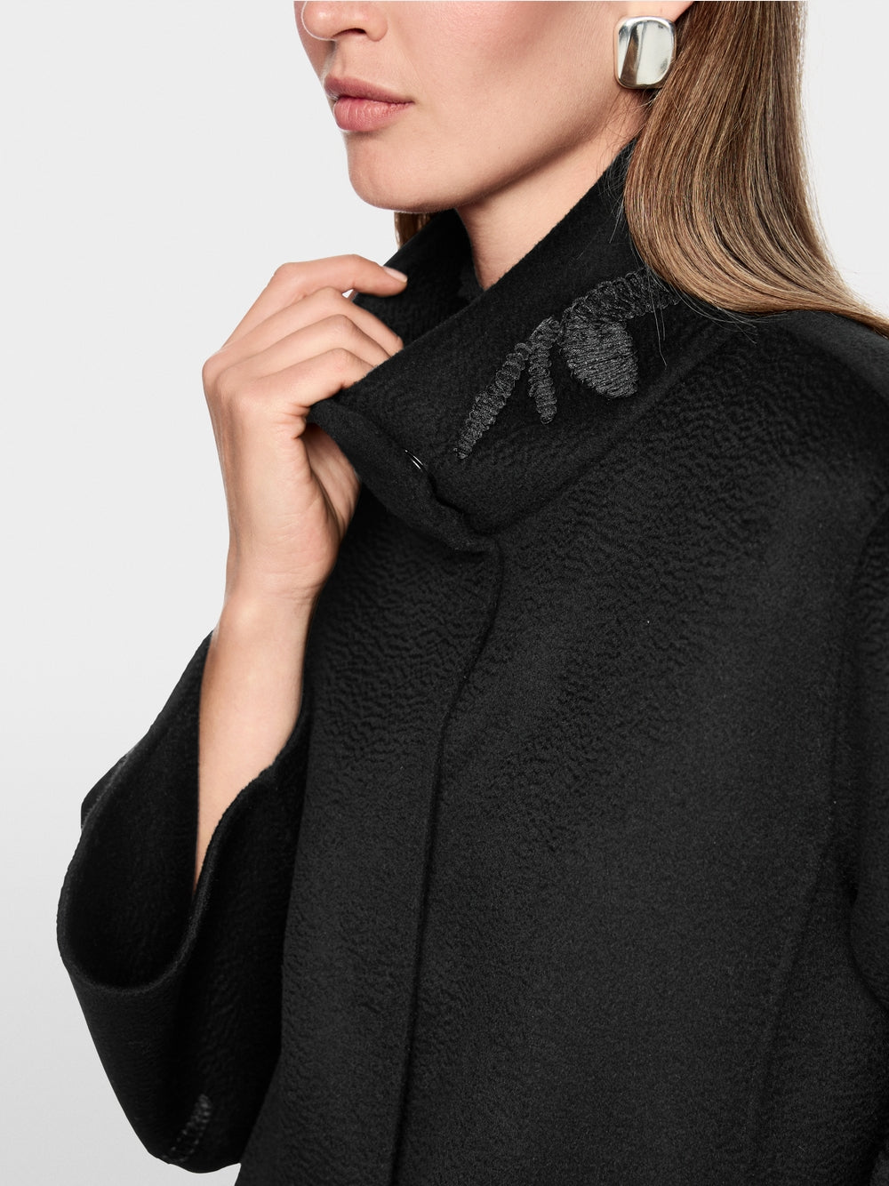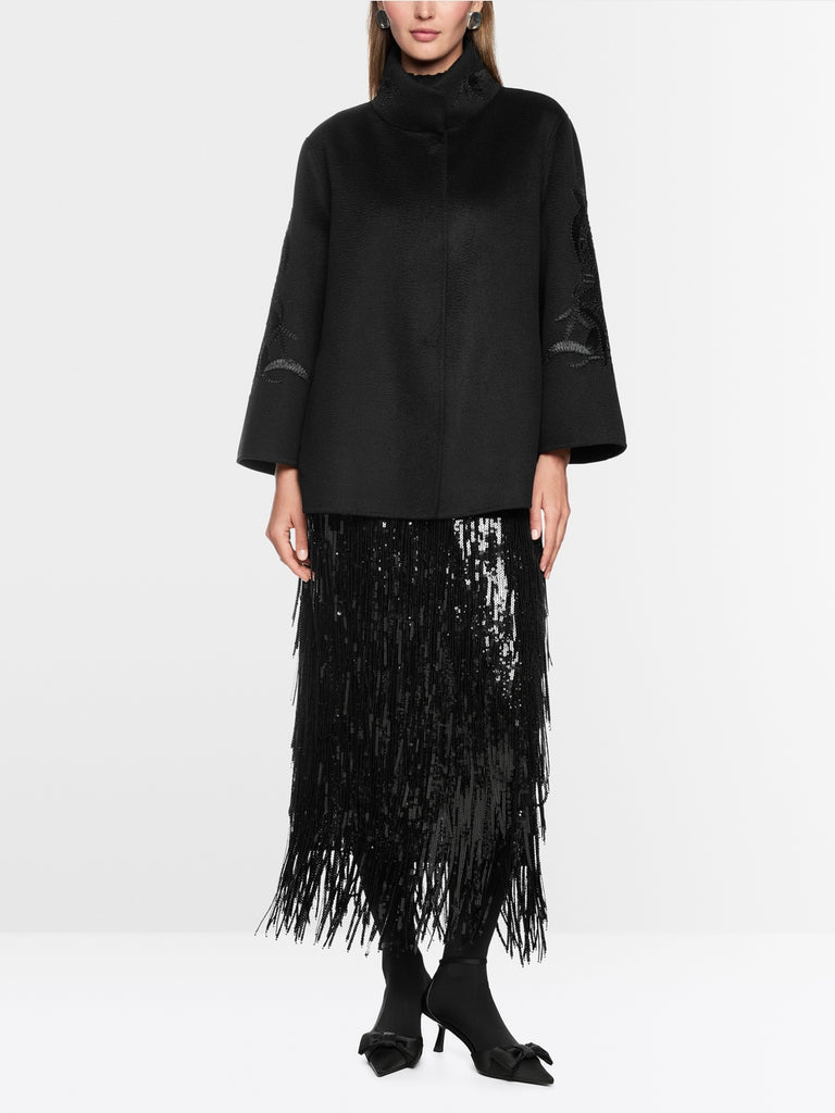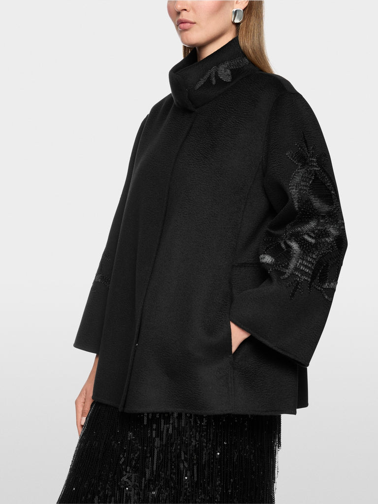 Elegant outdoor jacket in cape style made from 100% wool – in a loose cut for maximum comfort. This jacket can also be worn with a belt to accentuate the waist, while its striking, opulent embroidery gives it a sophisticated look. A stand-up collar, practical press stud fasteners and side pockets complete the design.