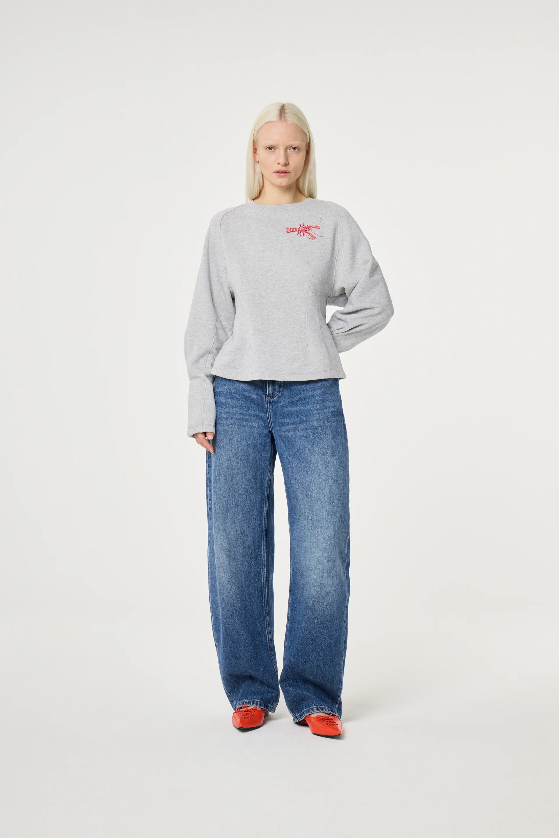 This grey sweater is crafted from 100% organic cotton for a soft, cozy feel. Designed with a flattering silhouette, it’s fitted at the cuffs and waist and features a playful lobster detail on the front for a touch of personality. Perfect for layering or wearing on its own for casual, effortless style.
