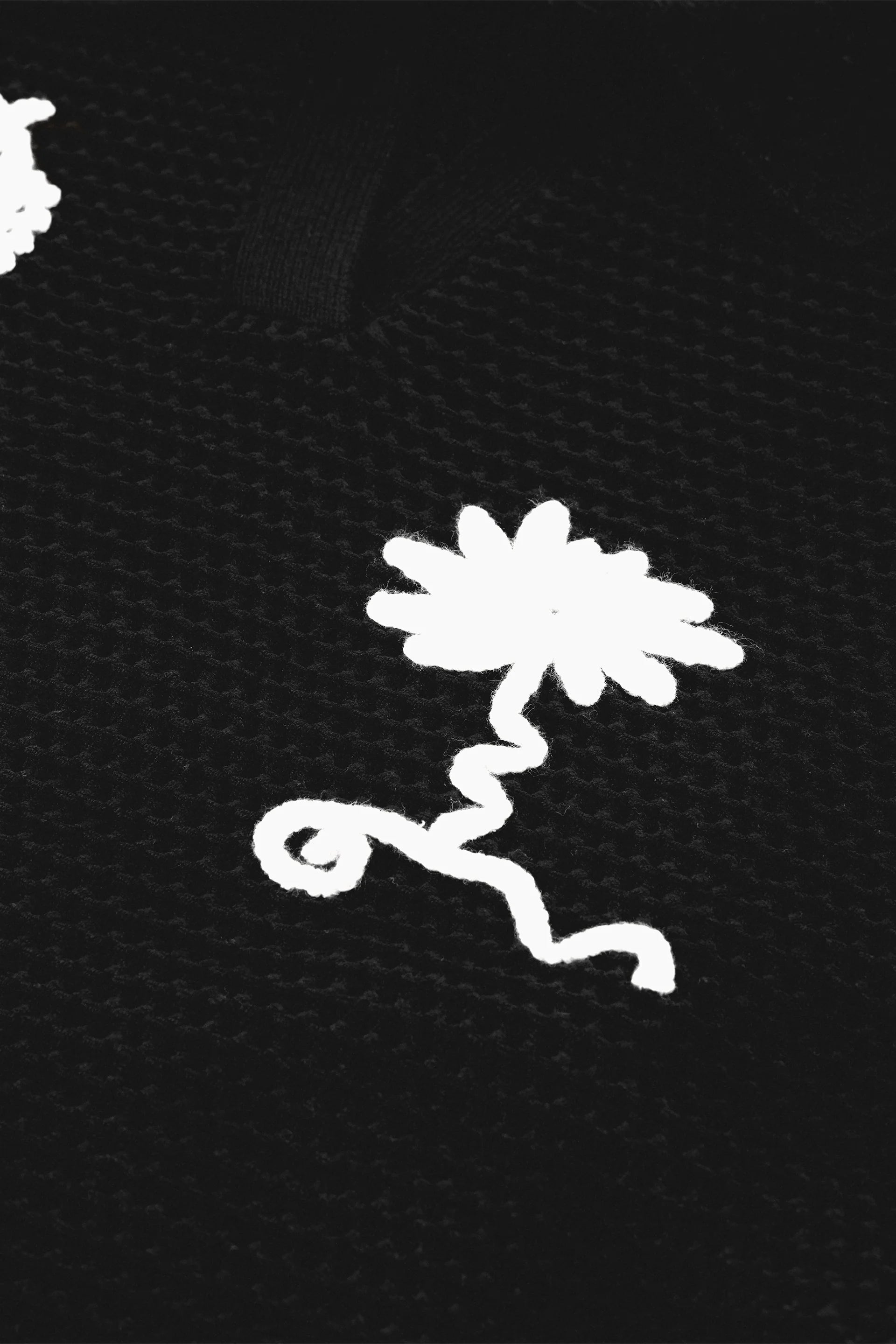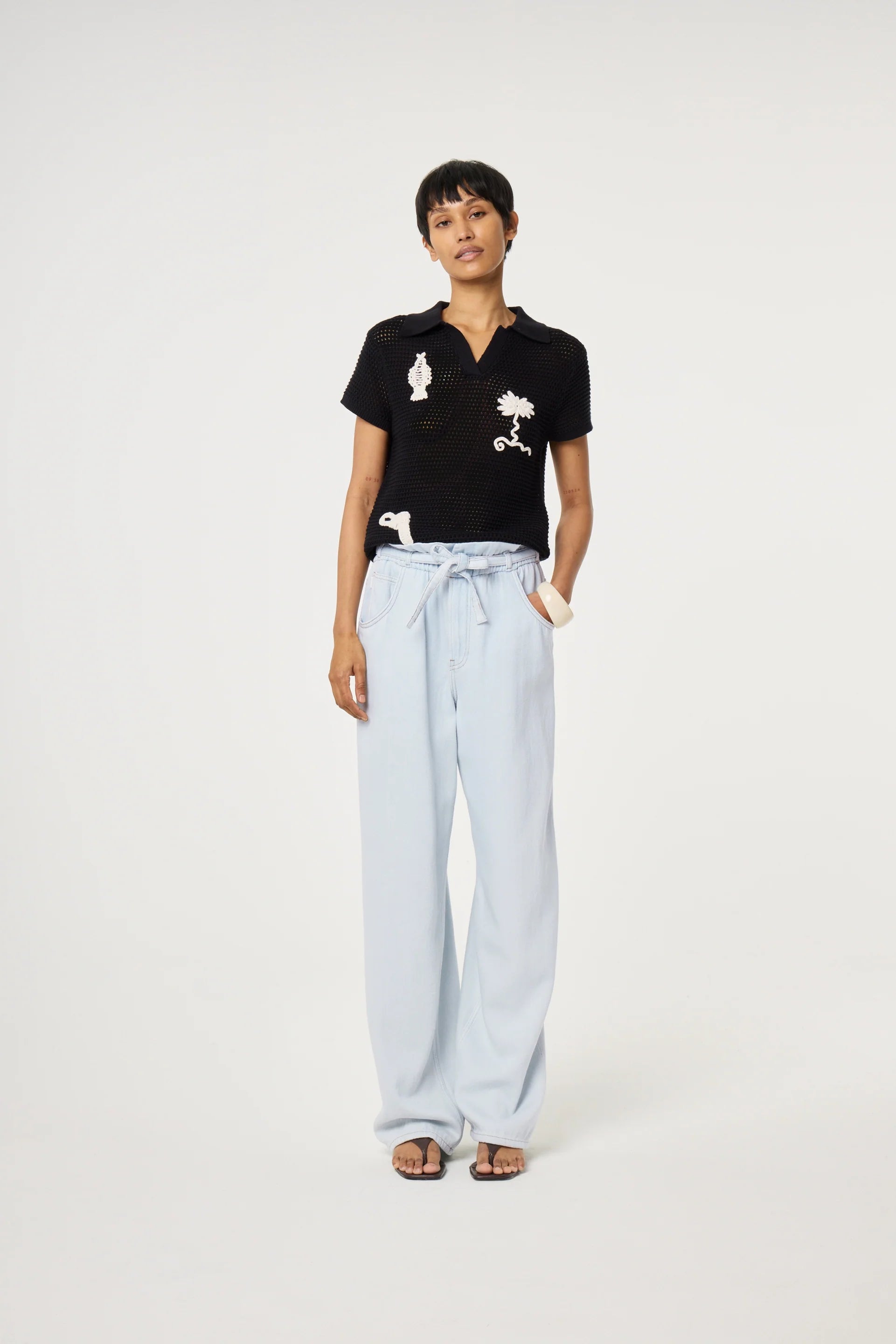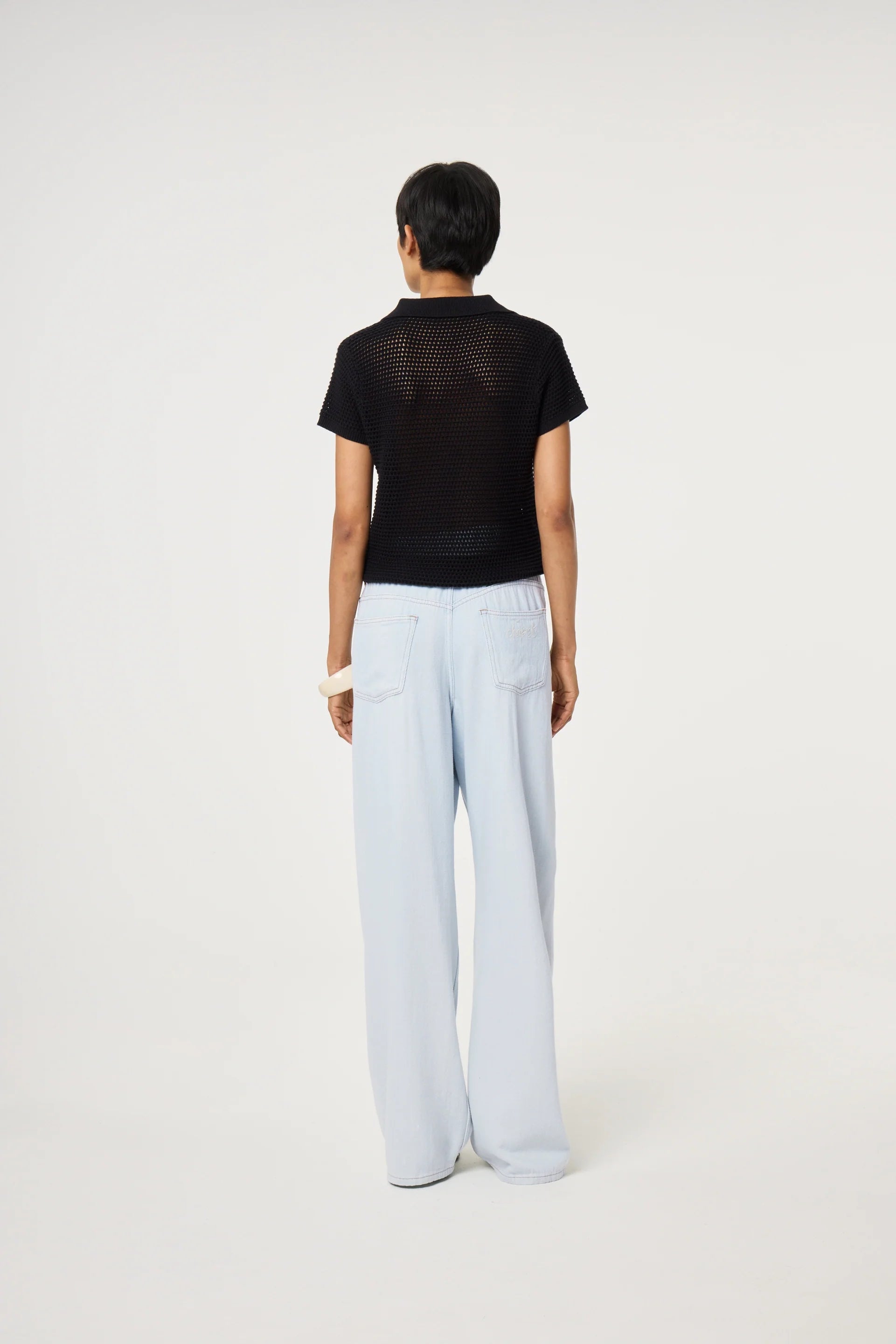 This short-sleeved black knit pullover features a timeless polo collar and an intricate open-mesh texture for a breathable, layered look. Perfect for breezy days, casual outings, or adding a conversational touch to your spring wardrobe. Pair it with jeans for a casual look.