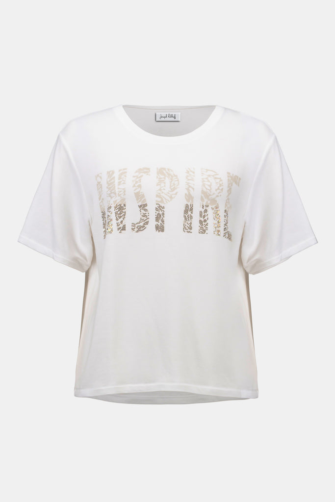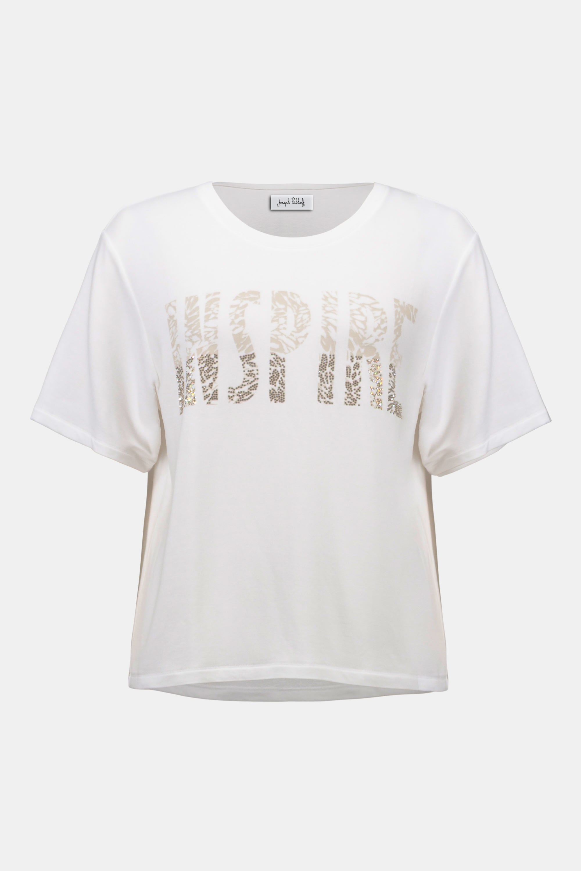 This solid t-shirt features a bold print with Rhinestones accents at the front, creating a statement piece for any casual outing. The three-quarter sleeves add a timeless touch, making it as stylish as it is comfortable.