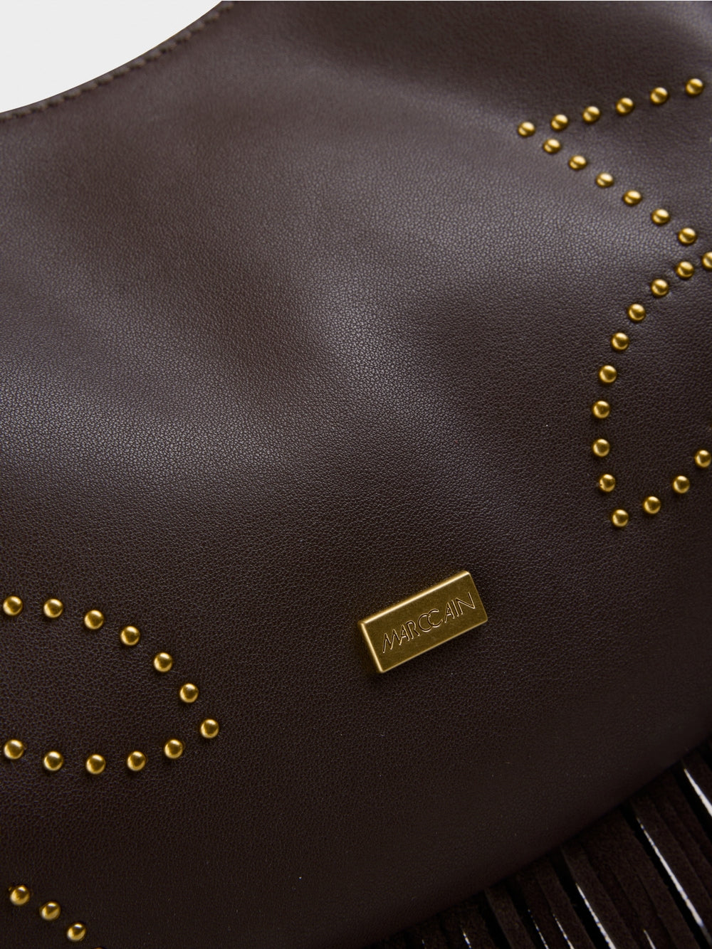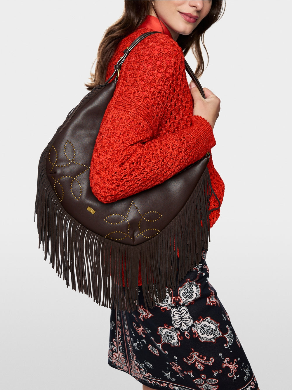 High-quality leather hobo bag in a trendy Western style. Decorated with decorative studs and fringes, it is a real eye-catcher. The sturdy leather handle makes it comfortable to carry, while the zip fastening keeps belongings secure.