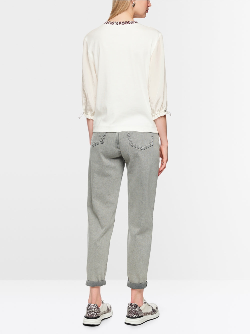 This blouse shirt comes in a trendy material mix and impresses with its special print. It comes in a loose fit with 3/4-length sleeves. The round neck and front of the shirt are adorned with a leopard print. In contrast to the rest of the shirt, the sleeves are made of a flowing material with elasticated cuffs.