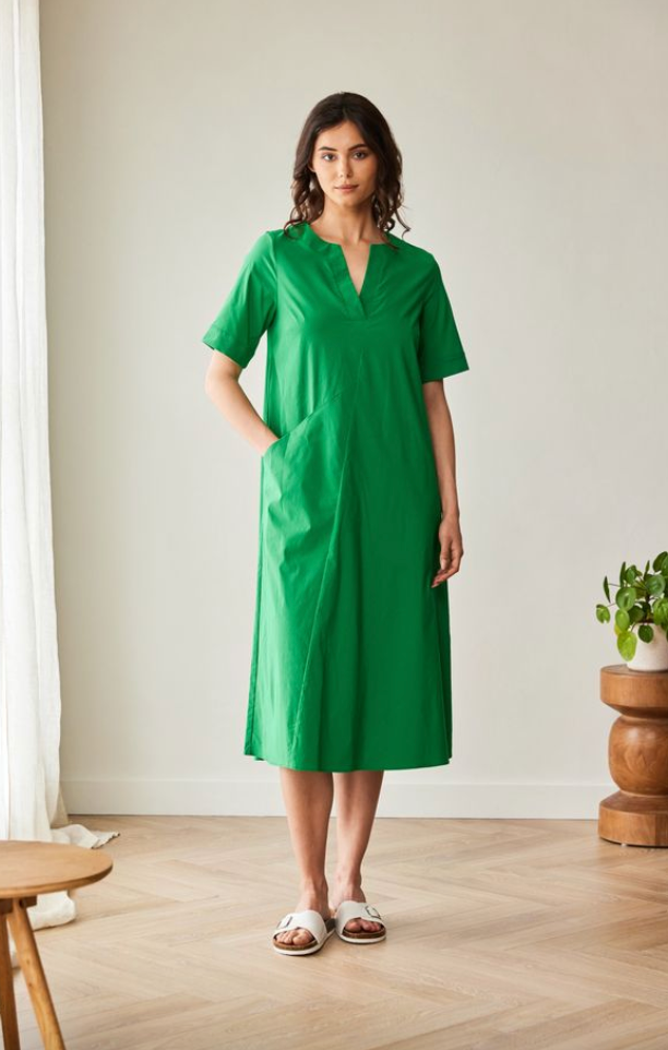 A striking dress designed for versatility and movement. The V-neckline creates an elegant silhouette while the asymmetrical pocket detail adds both visual interest and everyday functionality. Crafted for warm-weather wear, this piece transitions seamlessly from casual daytime occasions to evening gatherings. The thoughtful construction balances refined aesthetics with practical wearability, making it an essential addition to a curated wardrobe.