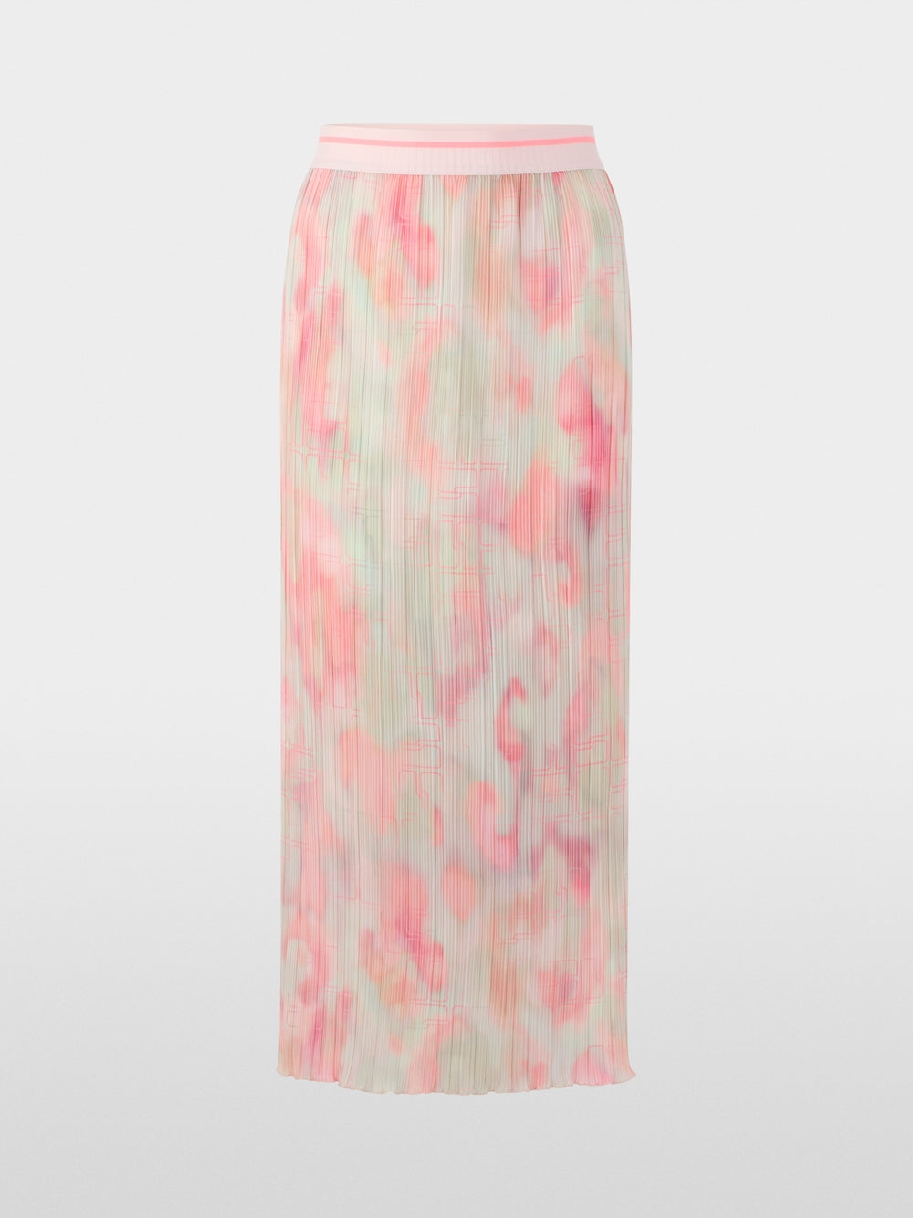 Pleated midi skirt made from flowing, lightweight material. The highlight of the skirt is the colourful all-over print. The practical elasticated waistband ensures perfect comfort and is complemented by a colour-coordinated contrasting stripe. The combination of texture, colour gradient and sporty waistband gives the design a modern yet feminine look.