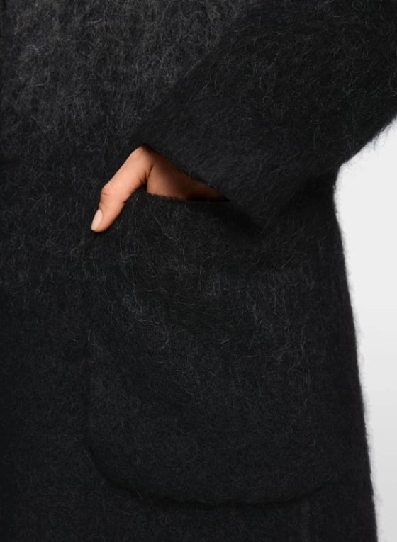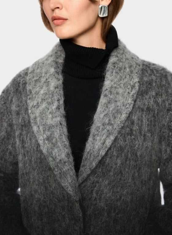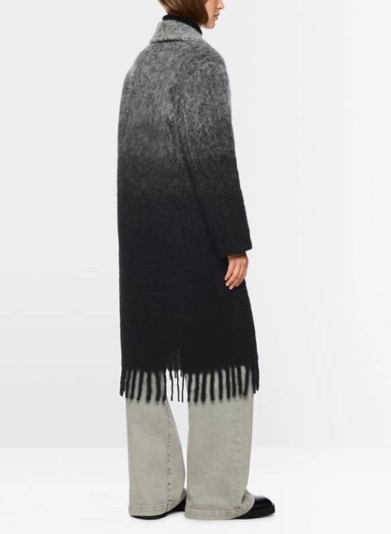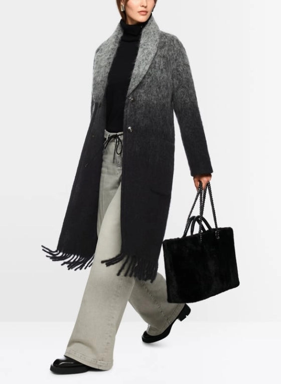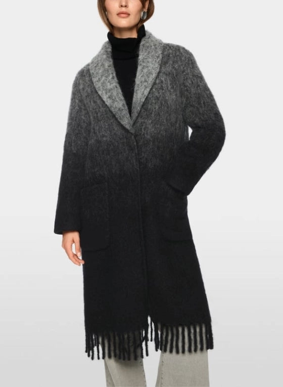 Trendy statement coat from Marc Cain, crafted from a luxurious blend of alpaca, mohair, and virgin wool. The relaxed fit and subtle color gradient create a contemporary look. Featuring practical snap fasteners, patch pockets, and refined fringe along the hem for a playful touch. A comfortable and stylish piece for unique fall and winter looks.