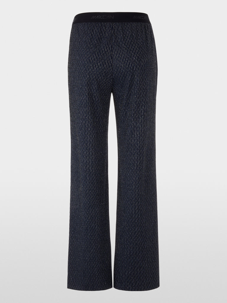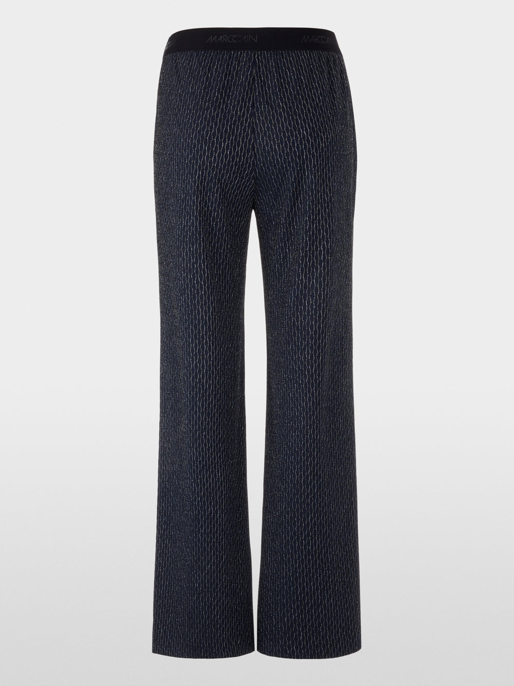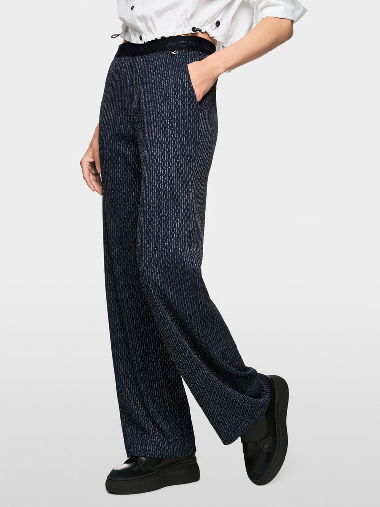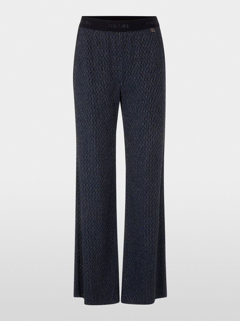 The wide-leg trousers WASHINGTON stand out with their special glitter details. Shimmering threads adorn these trousers in a wave-like pattern. The side pockets and elasticated waistband with the Marc Cain logo complete the look. An eye-catcher for special occasions.