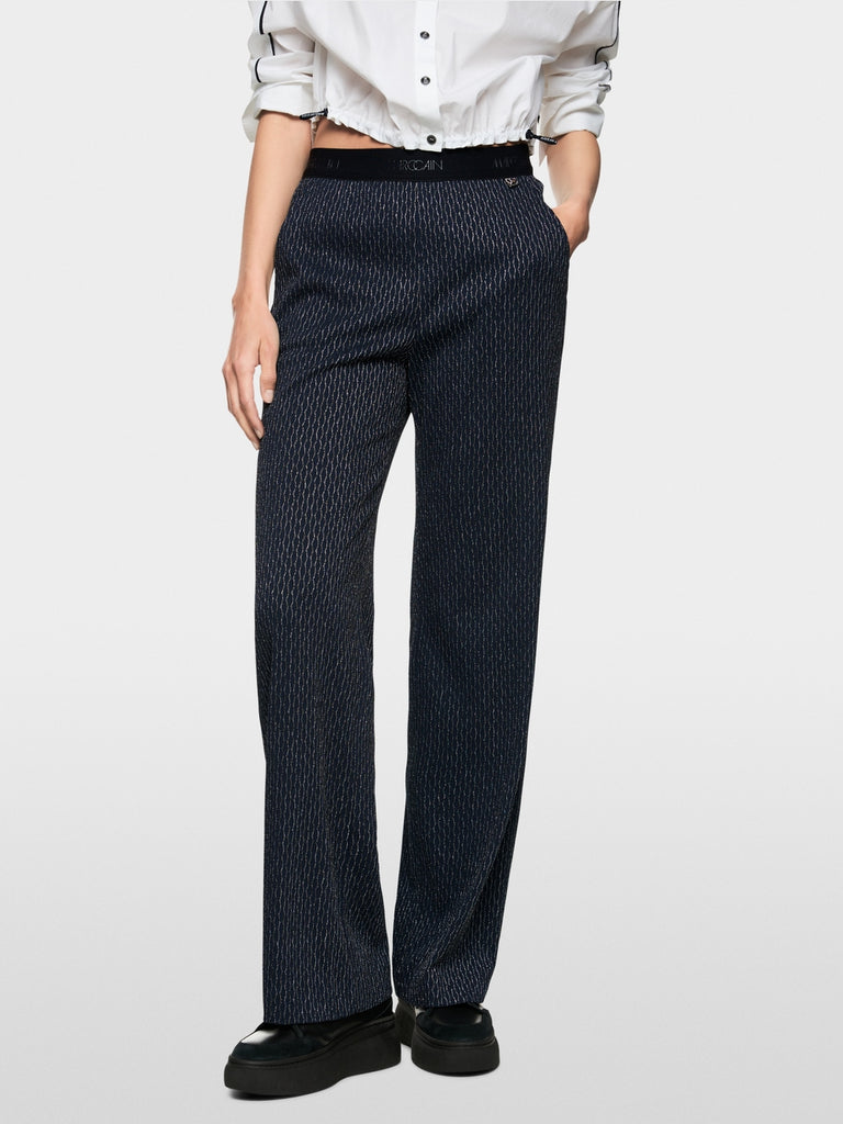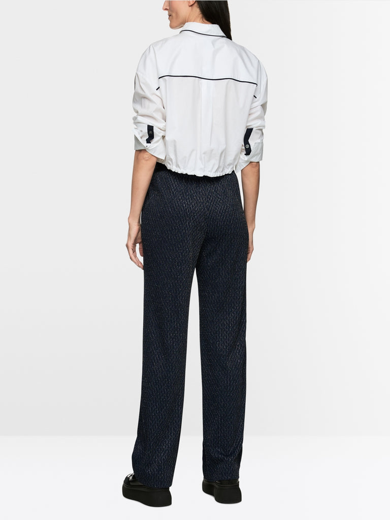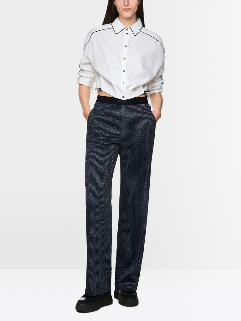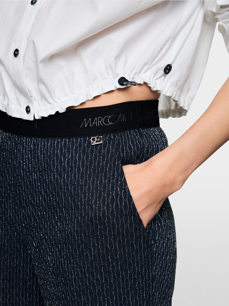 The wide-leg trousers WASHINGTON stand out with their special glitter details. Shimmering threads adorn these trousers in a wave-like pattern. The side pockets and elasticated waistband with the Marc Cain logo complete the look. An eye-catcher for special occasions.