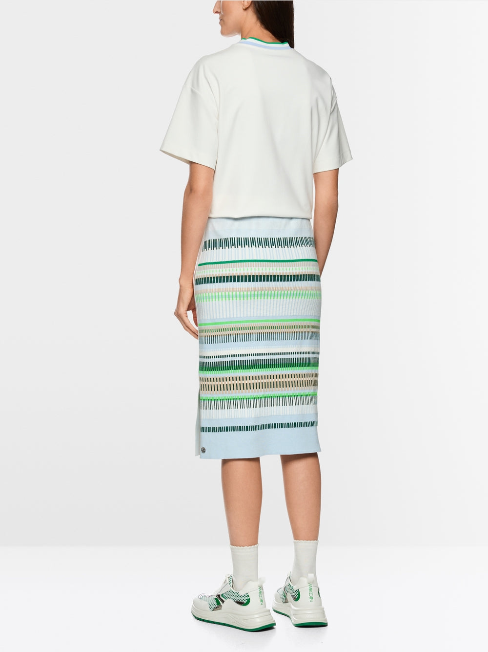 The calf-length knitted skirt in a multicoloured jacquard pattern combines comfort and style. The sporty, elasticated waistband with drawstring ensures a perfect fit, while a side slit and straight cut add a touch of modern lightness. Half-lined and made from a soft cotton blend. This garment is ‘Knitted in Germany’: the yarns are knitted on state-of-the-art knitting machines and the materials are finished in Germany.