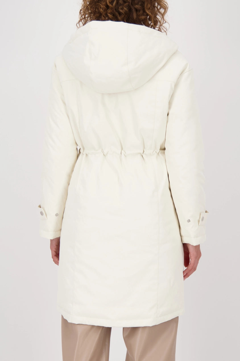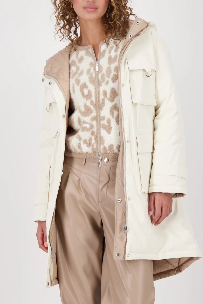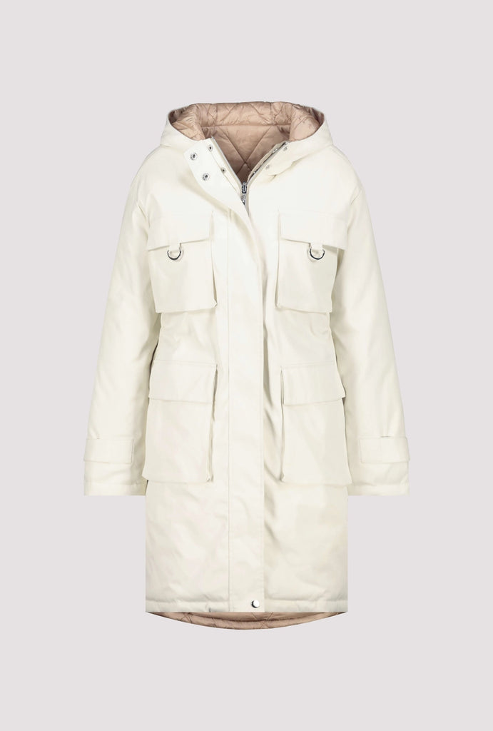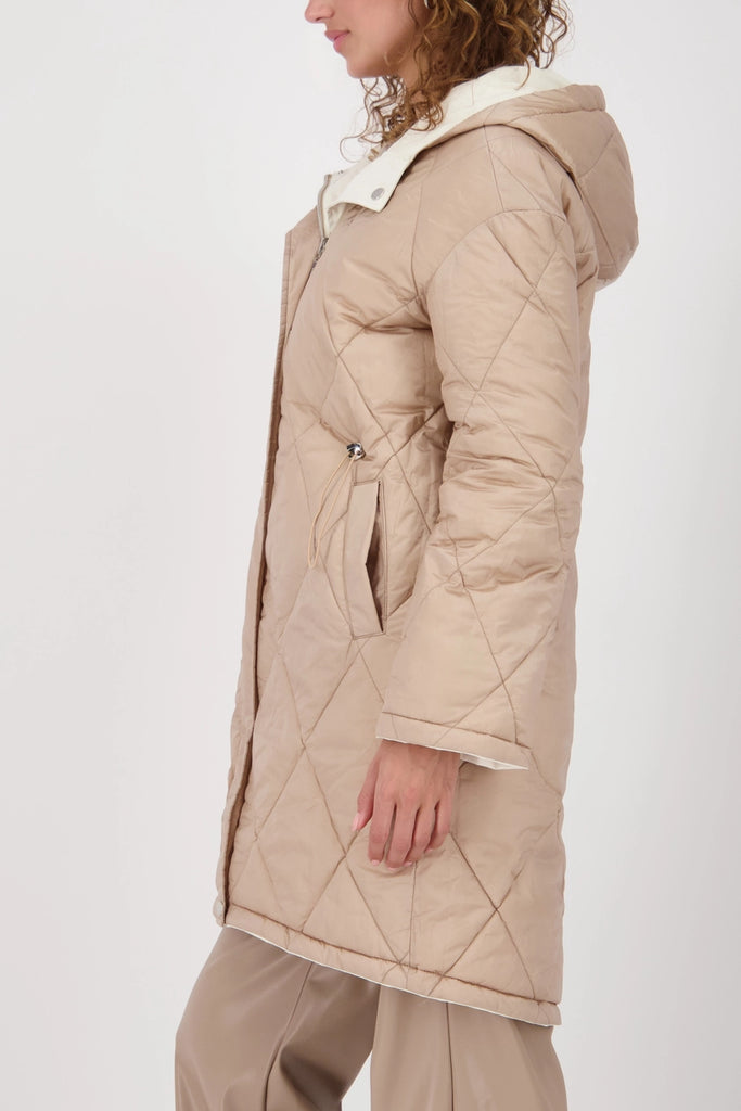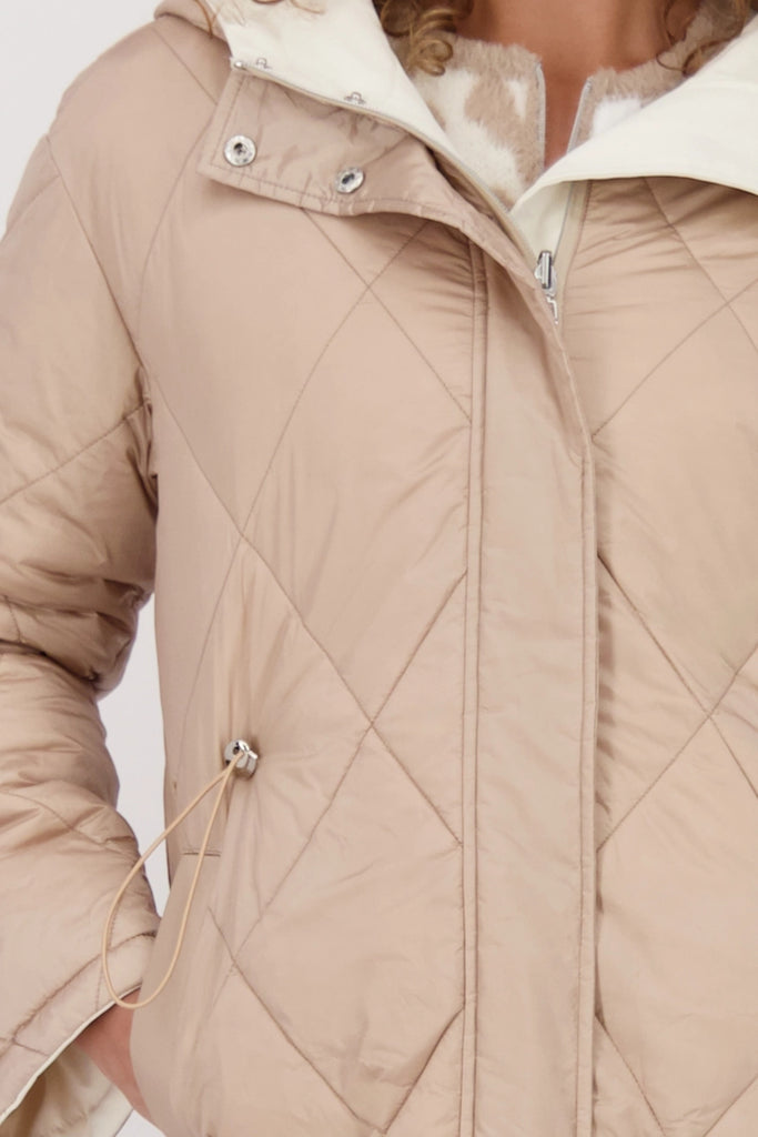 This reversible coat combines function and style with two wearable sides—one quilted, the other plain. The regular fit, a protective hood, and an adjustable elastic waistband ensure comfort and a feminine silhouette. Practical flap pockets, hand pockets, and sleeves with buckles and snap fasteners make it the perfect companion for versatile looks. The extended back completes the design.