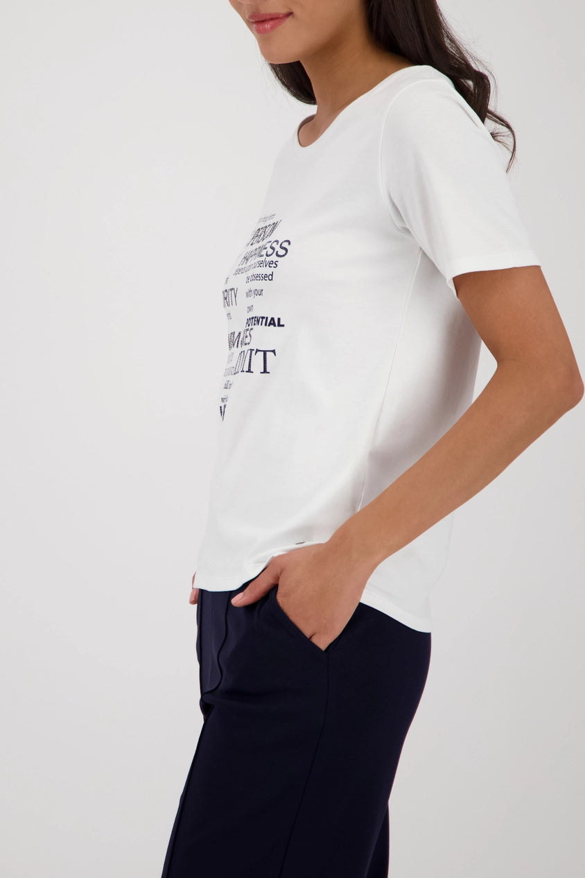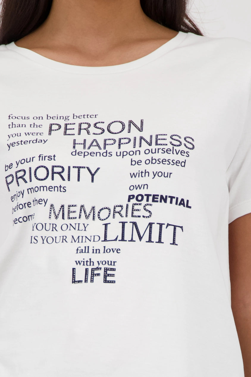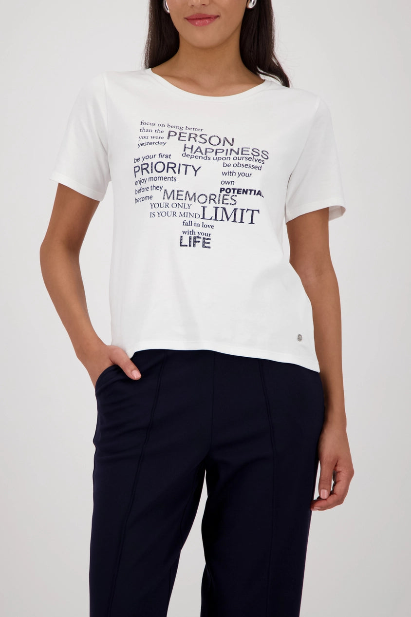 The 100% cotton T-shirt impresses with its simple lettering and sparkling rhinestones.