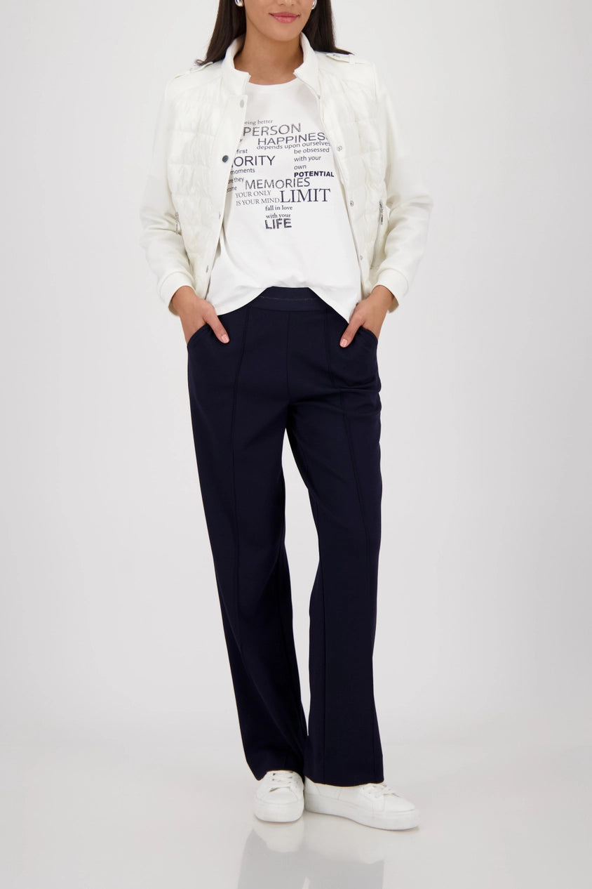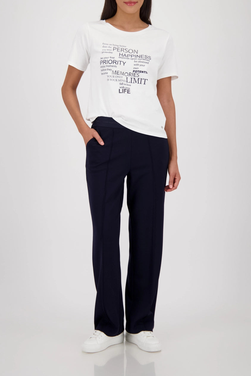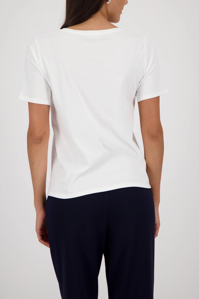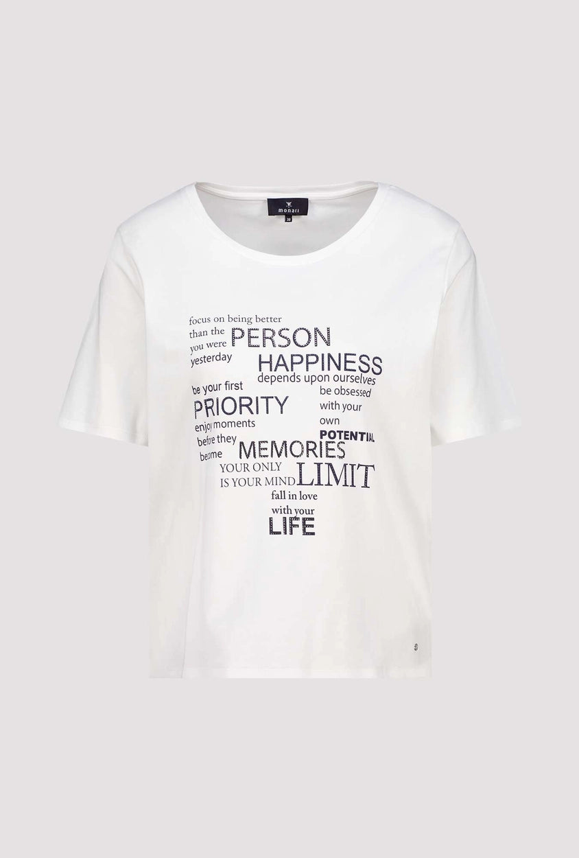 The 100% cotton T-shirt impresses with its simple lettering and sparkling rhinestones.