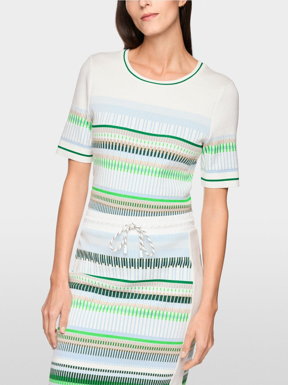 Slim-fit fine knit jumper in a soft cotton blend with an elegant jacquard pattern. The classic round neckline and short sleeves lend the design a feminine lightness. This garment is ‘Knitted in Germany’: the yarns are knitted on state-of-the-art knitting machines and the materials are finished in Germany.